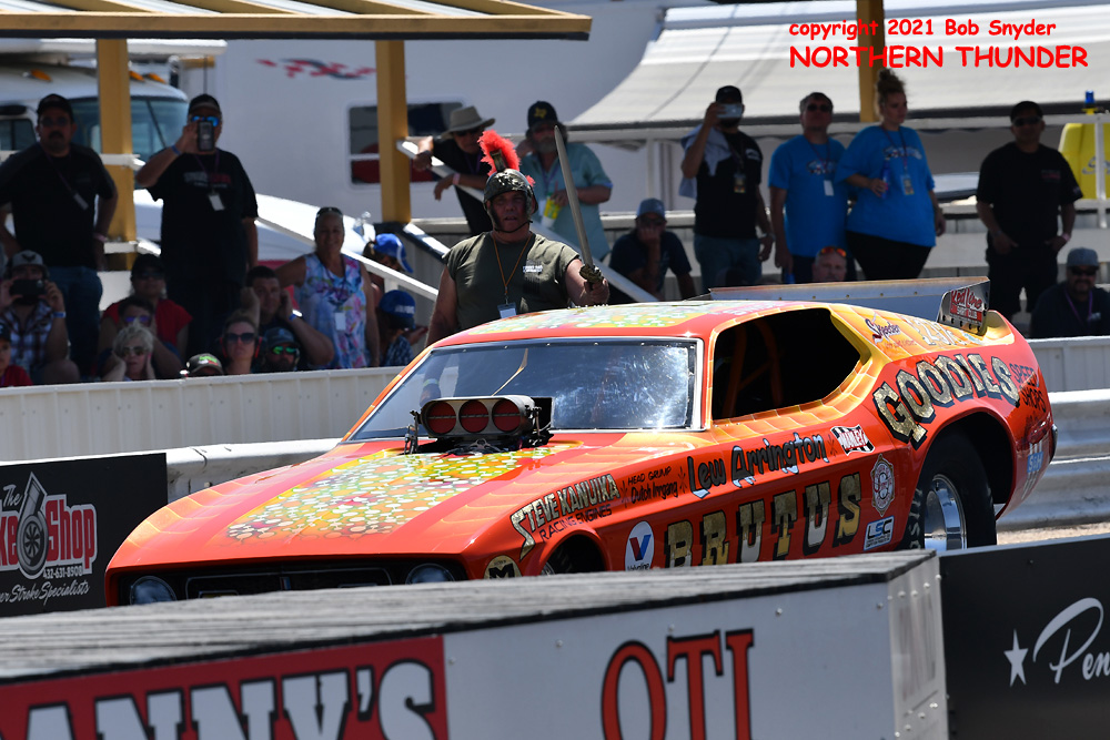 (RIGHT) In one of the most colourful cars on the circuit, second generation funny car driver, Bob Alberty Jr. pushed his "Thunderin' Okie" to a decent 4.440 - 158.39 to place him solidly into the "B" field in the #14 position