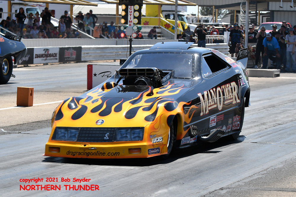 (LEFT) The first qualifying session got underway on Friday evening with Jordan Ballew sporting a new Camaro body on his well-known "Ballew Thunder" entry. His best effort of the evening was a decent 4.750 - 144.97, placing him in the #21 position on the qualifying list