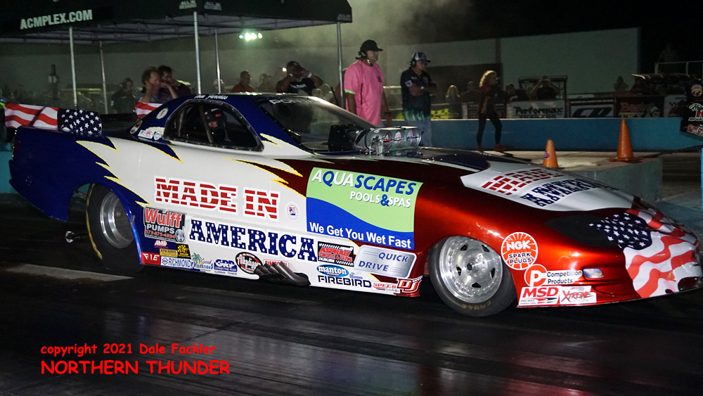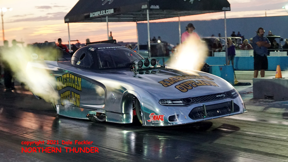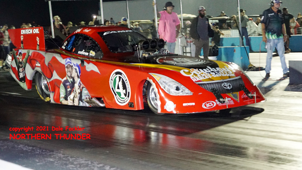 We lead off our coverage with a picture from the first session, with Nick Poloson (near lane) in the "Bucket List" taking on the #2 man in the points chase, Kirk Williams (far lane) in his "200 Proof" entry. Poloson's best run was 3.829 - 186.03 slotted him into the #4 position on the ladder, while Williams landed in #2 with an even better 3.703 - 207.28, which stood for the provisional top speed of the meet.