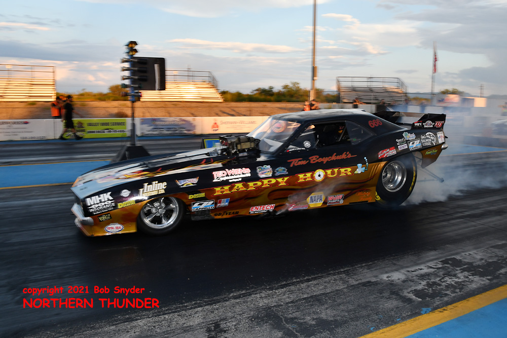 (LEFT) Lighting up the tires before making his first pass of the evening, Tim Boychuk blew the dust off his seldom-seen (in the past few years) "Happy Hour" Camaro.