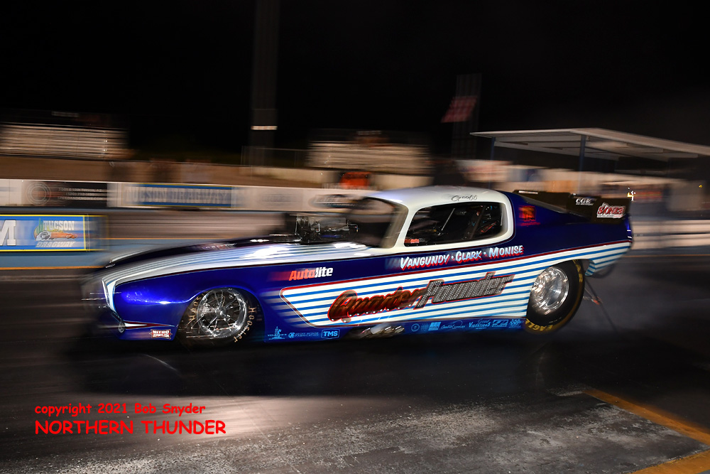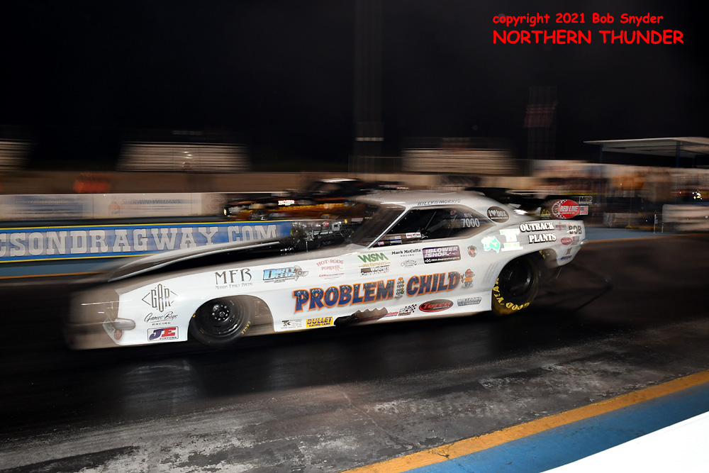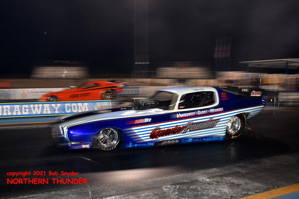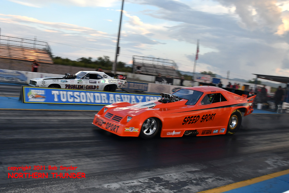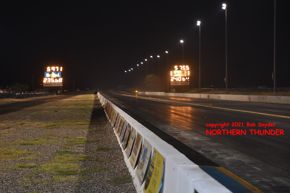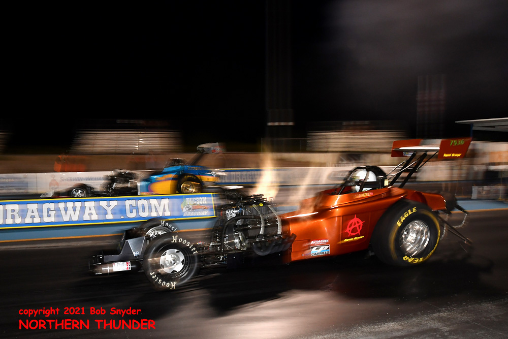 (LEFT) Leaving first and running away with the win was Tim Boychuk (near lane), as his 5.829 - 243.50 easily covered James Day's slowing 7.226 - 130.30 pass. Boychuk's 243.50 mph speed was tops of the night.