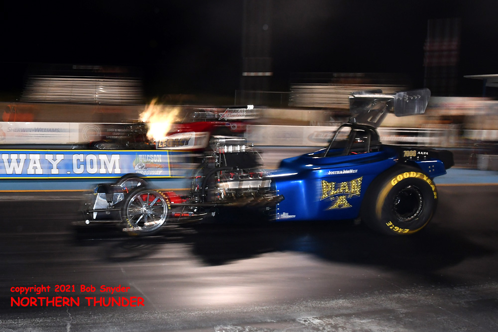 With flames flickering high out of the pipes, the "Family Legacy" 23-T Ford of Jim Maroney (far lane) launched against the senior statesman of the class, Johnny 'Plan A' West (near lane).