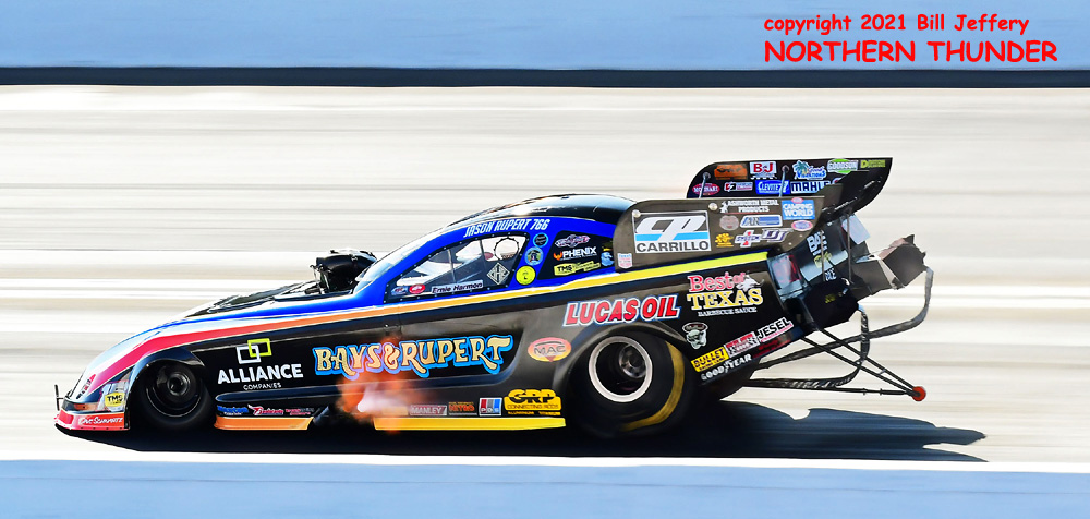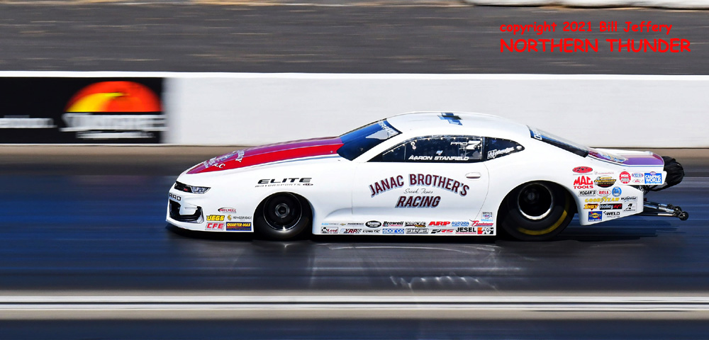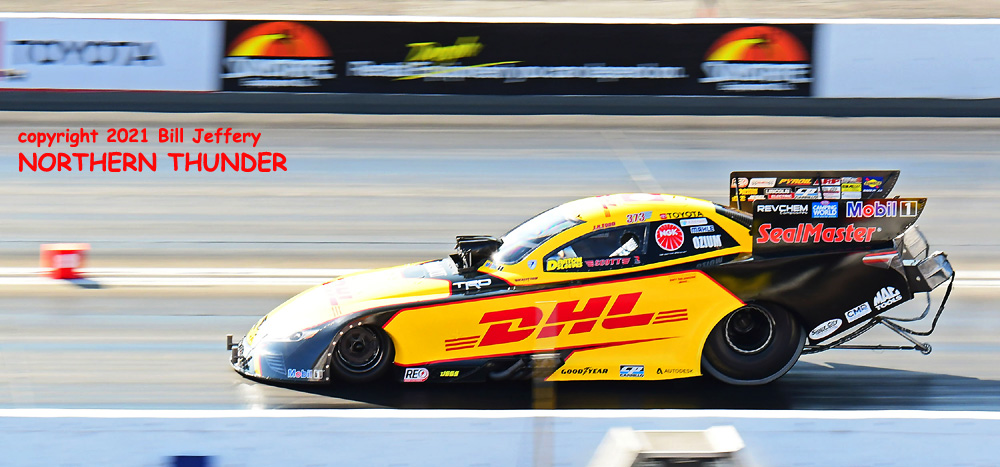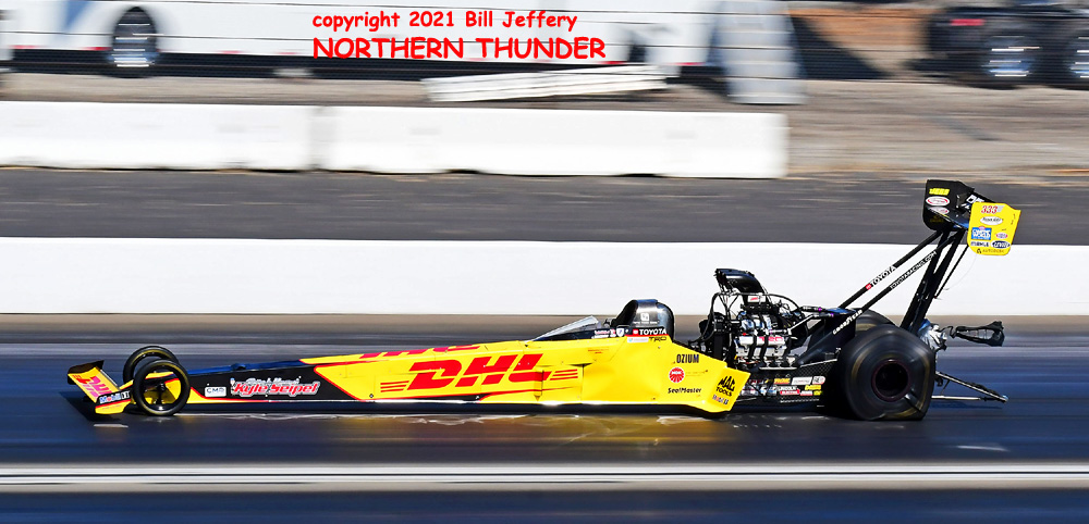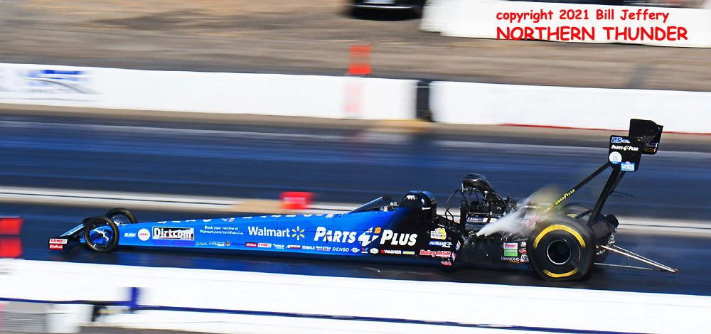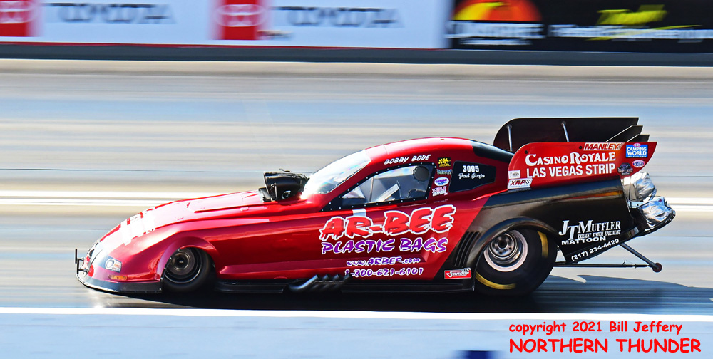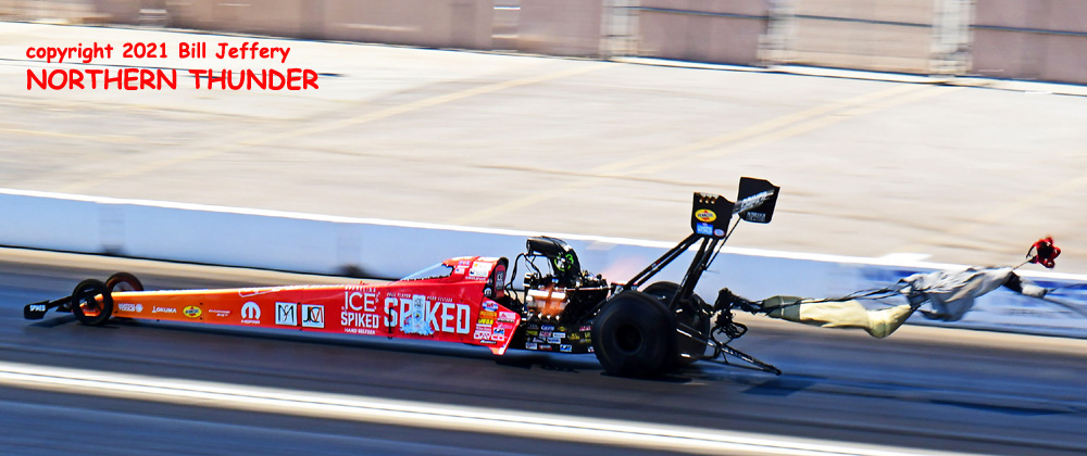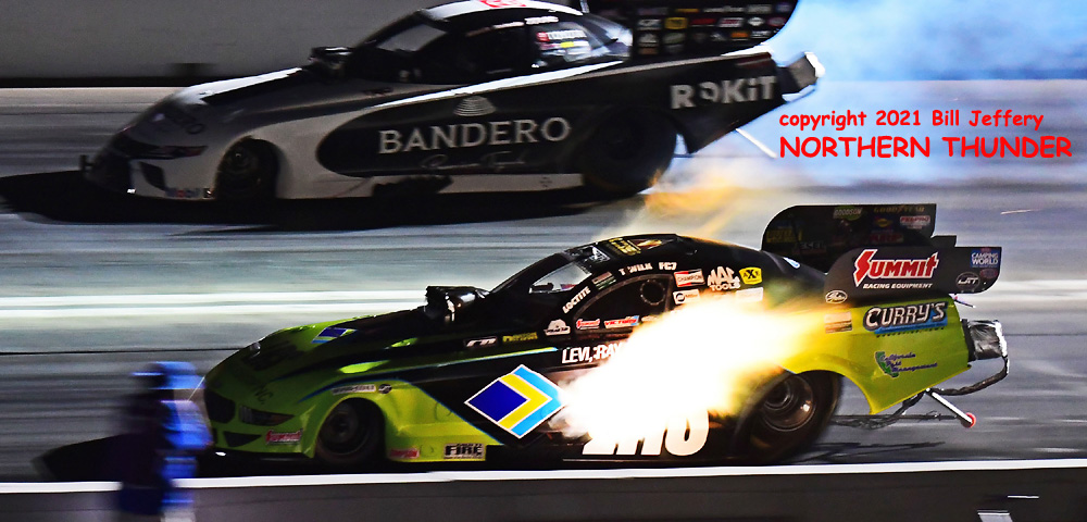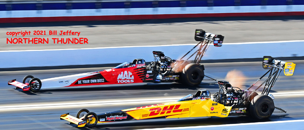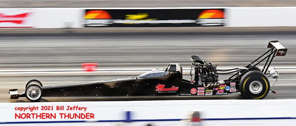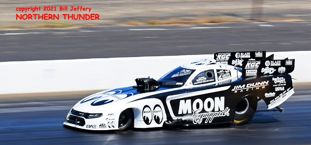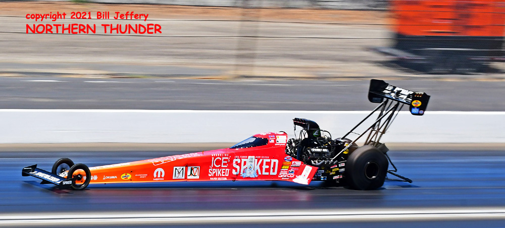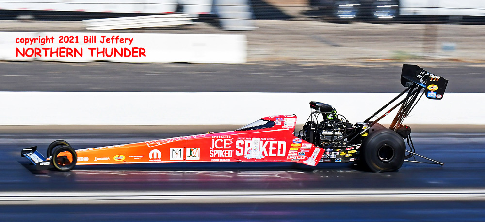 (RIGHT) Could lightning strike twice? The second pair featured #3 qualifier Blake Alexander (not shown) against the never-say-die Jim Campbell and in the second major upset of the round, Campbell took the win by a 4.223 - 289.57 clocking to a losing 4.342 - 248.25 for Alexander when his car headed for the wall just before the 660' mark. That was the first round win for the Jim Dunn team since the February 2020 race in Phoenix. That is truly a very long dry spell.