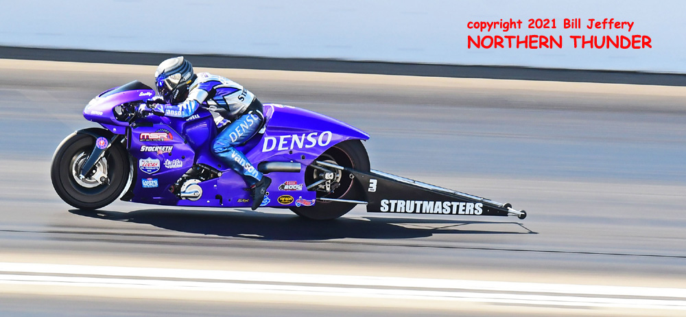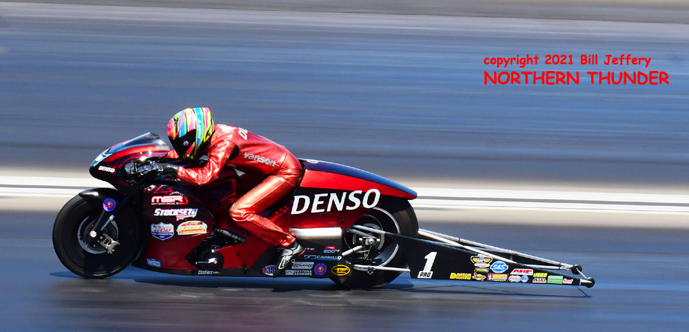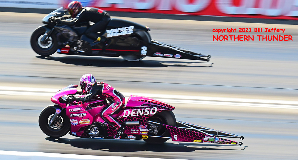 (LEFT) It looks like Angie Smith (near lane) is trailing Eddie Krawiec (far lane) by nearly a full bike length in this shot.