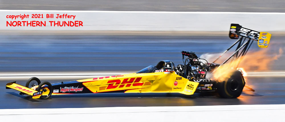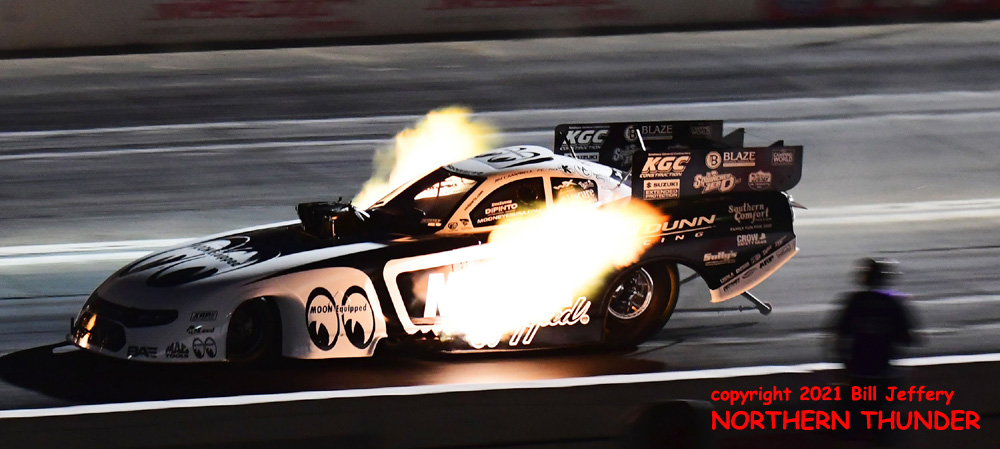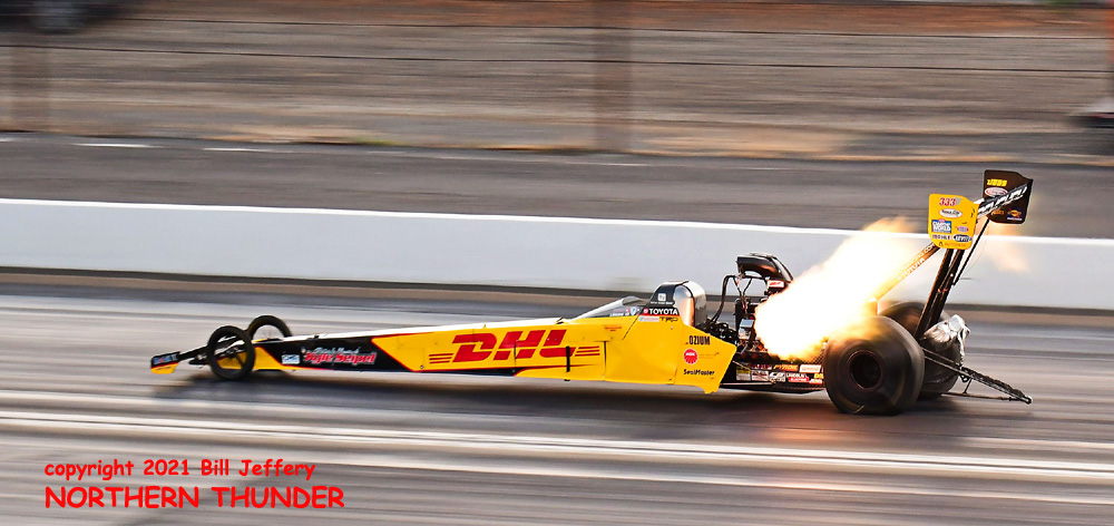(LEFT) With big flames in the late afternoon and a serious arch in the chassis, Steve Torrence climbed out of the basement (#13 with a 6-second best) all the way to the #2 spot with a very strong 3.808 - 322.27 pass. It was also top speed of the meet.... for a few minutes.