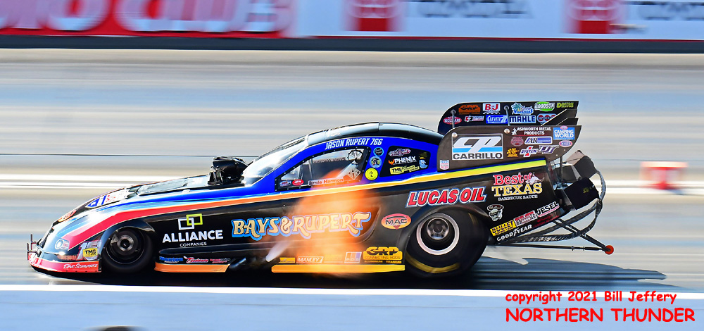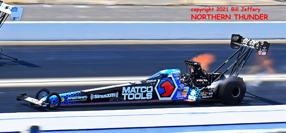 Trying hard to chase down Blake Alexander as they headed to the top end, the Dunn Racing car was bathed in green light as it neared the 660' lights, while Alexander opened the gap on Jim Campbell. While Campbell shut off early to a 4.340, Alexander kept the pedal down for the first 3-second run of the weekend, a very good 3.961 - 318.44 that gave them the #1 qualifying spot for the day.