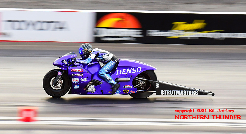 (LEFT) Unmistakable in her bright pink leathers, Angie Smith didn't improve on her earlier 6.901 (good for #6 qualifier) effort and only posted a 6.960 - 186.85, with a possible early shutoff.