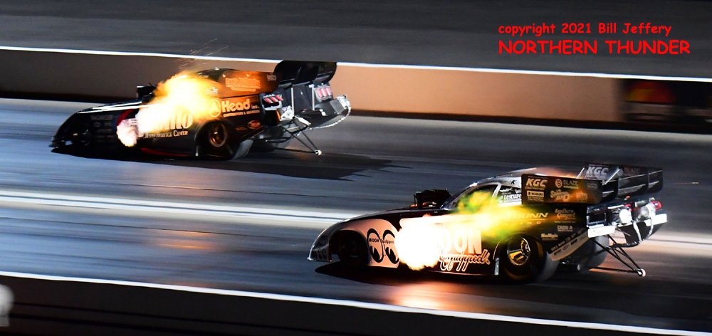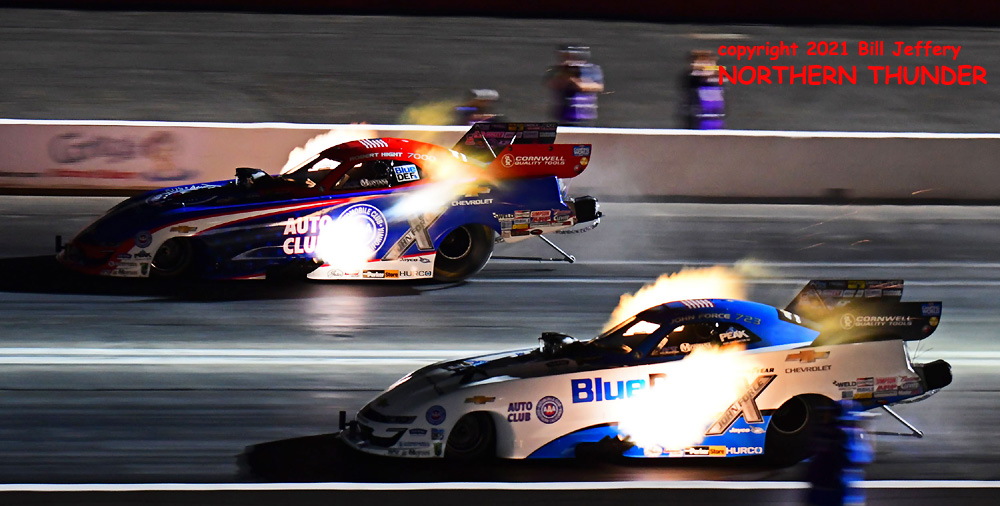 (LEFT) Running almost side-by-side at this point, the CEO of JFR Racing (aka: The Boss), John Force in the near lane, kept pace with the JFR President, Robert Hight (far lane) until he gave up the fight after pedalling his way to a 4.552 - 283.67 timeslip.