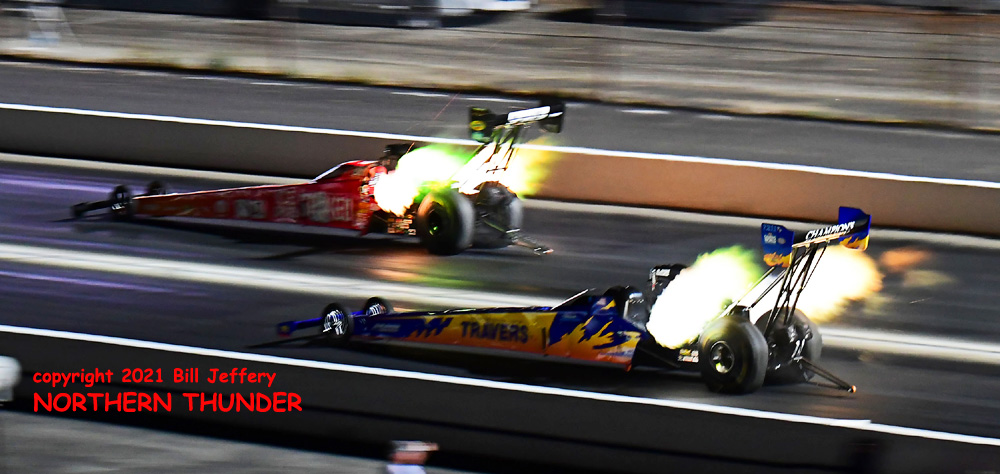 (RIGHT) Sporting the tribute to the Johnson Brothers team with the "Travers Tools" wrap on the car, Mike Salinas (near lane) is shown here pulling away from Clay Millican (far lane) as they neared the finish line. Despite at least one cylinder out, he still turned low e.t. of the round with a 3.874 - 313.37 for the win and lane choice over Pruett in the third round.