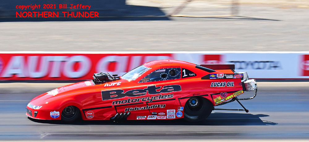 (LEFT) Running by herself as scheduled opponent Jim Campbell pulled out of line when team owner Jim Dunn saw that they couldn't be bumped, Alexis DeJoria made her last ditch attempt a good one as she moved from #18 to #6 and a first round matchup with a lower qualified car. Her run wasn't earth-shaking but the 4.021 - 313.73 was the third quickest and fastest of the session.