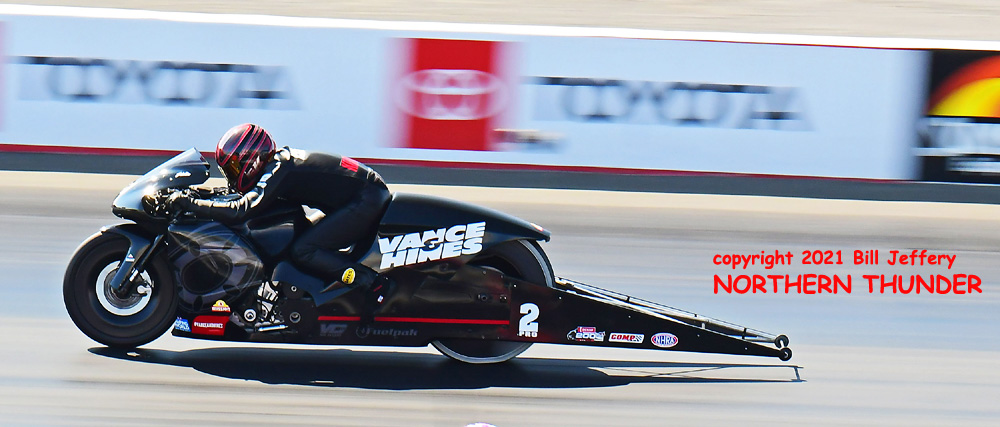 (RIGHT) Running alongside Smith in this session was one of the Vance & Hines bikes, with former world champion Eddie Krawiec aboard, and he lost half a tenth from his Friday night 6.903 clocking (which put him #7 in the field) and slowed to a 6.950 - 198.15 to remain in the seven spot.