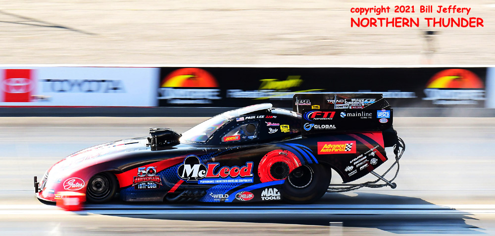 (RIGHT) Next up were Paul Lee (near lane) and Bobby Bode Jr. in the far lane. Bode was off the throttle at half track and only clocked a 4.950 - 155.63, as he dropped one spot on the ladder to #15, earned with an earlier 4.682 pass. Lee made the most of his last chance, climbing from outside of the field all the way to the #7 spot with a very nice 4.045 - 311.85 result.