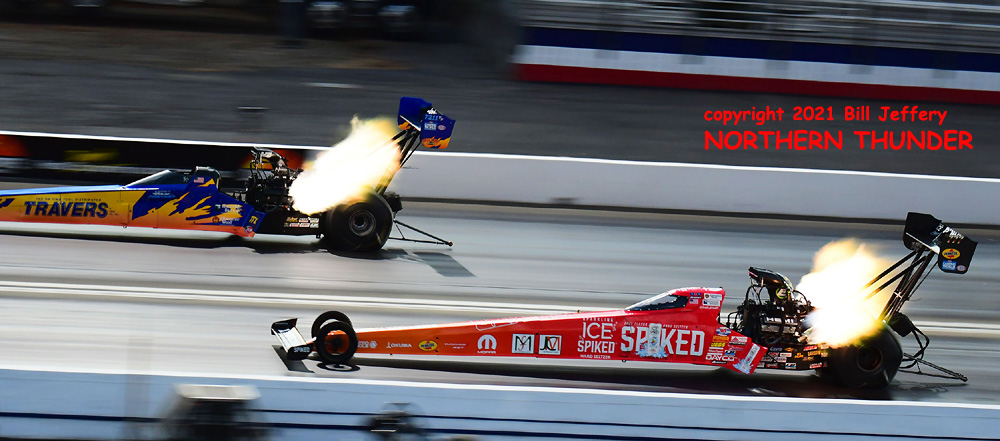 (RIGHT) Speeding away in the far lane is defending world champion Matt Smith enroute to the quickest pass of the session (6.841- 198.96), only slightly slower than his top qualifying effort from Friday evening (6.806 - 199.20). Trailing in the near lane is Joey Gladstone who slowed nearly a tenth from his earlier #3 qualifying 6.889 pass to a 6.968 - 196.02 on this run.