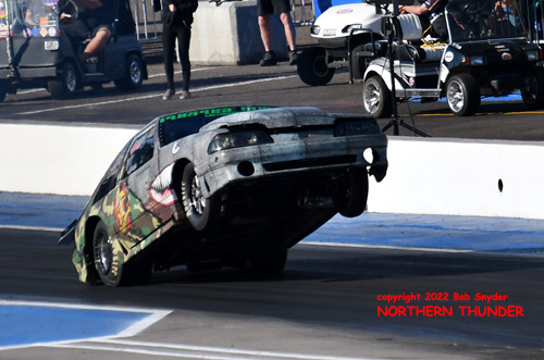 (RIGHT) In the first pair of the round, Arizona's Jim Maroney made his third pass of the weekend, but failed to improve on his earlier 3.930 best, shutting off after half track to a 4.382 - 187.81 to leave himself in the #15 spot going into eliminations.