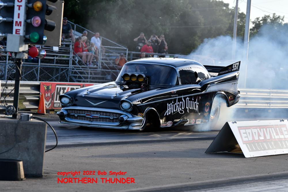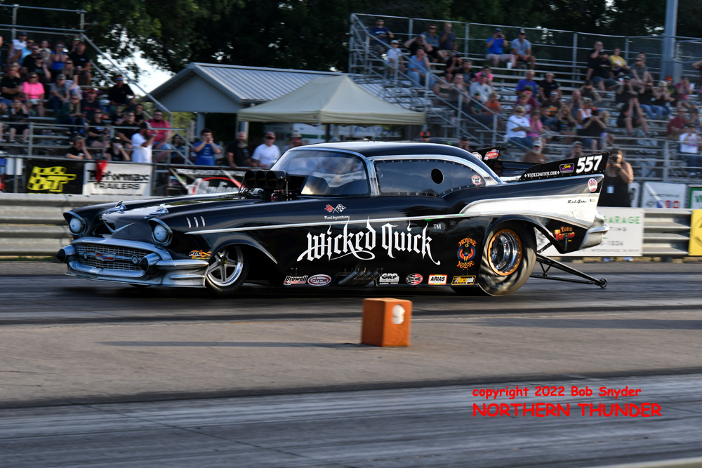 Running by himself as his opponent Mike Buchanan in the "Hombre" broke on the burnout, North Dakota's Jim Chase in the unique '55 Chevy bodied "Wicked Quick", equipped with a BIG Brad Anderson Hemi, laid down one of the best numbers of the first session. He left hard with a .987 time at 60', then pedalled it just past the 330' mark before clicking it to a 4.004 - 154.64 time, good enough for #2 on the provisional qualifying sheet.