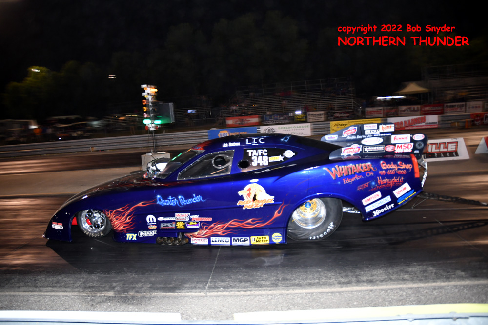 (RIGHT) Coming back on tour after missing three races due to major engine damage at the season opener, Nick Johnson brought the Camaro-bodied "Razzle Dazzle" back out and laid down a decent 4.323 - 163.10 on his first pass in four months.