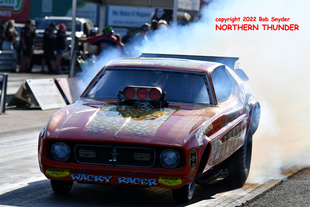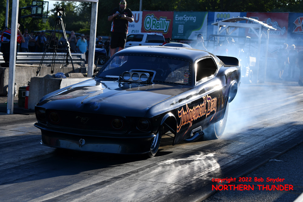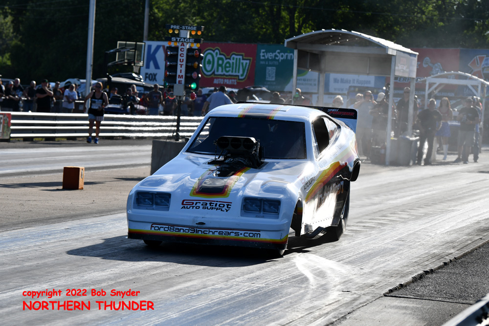 (LEFT) One of the shorter wheelbased cars on the circuit, Justin Herbst's Monza-bodied "Scorpion" came out next and "Hot Rod Herbie" laid down one of his patented half track burnouts. The Big-Block Chevy powered entry pounded out a solid 4.654 - 146.29 to grab a provisional spot in the "B" field.
