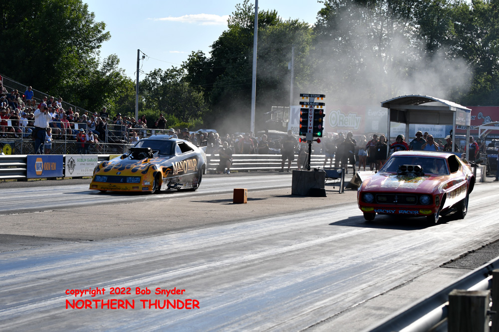 (RIGHT) Nearly buried in the smoke from Butherus' burnout, Wayne Hofmann lit up the tires in the Omni-bodied "China Syndrome", paying homage to one of the names his father Al Hofmann fielded in NHRA Funny Car action in the 1980's.