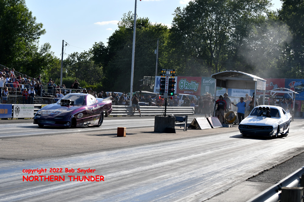 After a hard burnout in the Mustang-bodied "Brutus" (LEFT photo), the Troxel & Schneider entry, with Chris Schneider at the wheel, they were able to hold off the hard charge of opponent Shayne Lawson in the later model Mustang-bodied "Man O' War" (RIGHT photo).