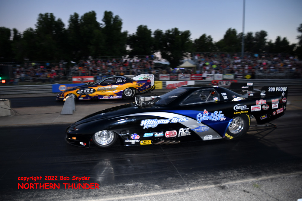 (RIGHT) In a great matchup of full-on Top Alcohol floppers, Kirk Williams (near lane) overcame an early lead by opponent Mike Newkirk (far lane) and lit up the scoreboard with a great 3.70 - 206.52, for a new low e.t. and top speed of the meet. Newkirk's good try fell short as he stopped the clocks at 3.87 - 190.03, for his best run of the weekend.