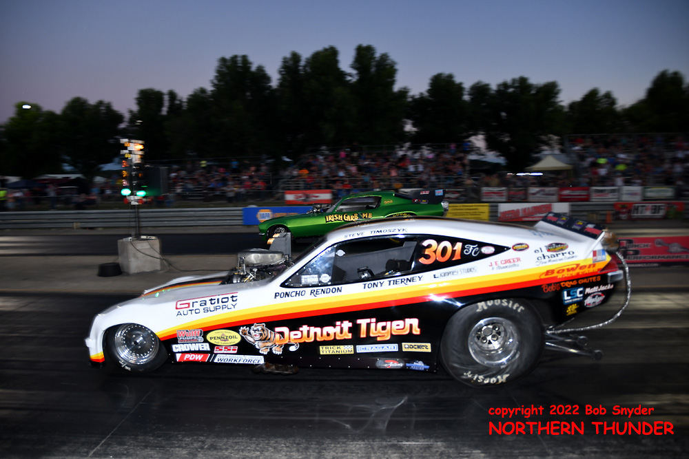 (LEFT) Keeping up the pace, Tim Cullinan (far lane) took another winlight and advanced to the final round, as opponent Steve Timoszyk kept it close until the 330' mark, before falling back and coasting across the finish line. Cullinan's 4.21 - 164.84 was his best of the weekend as the team gradually crept up on the tuneup.