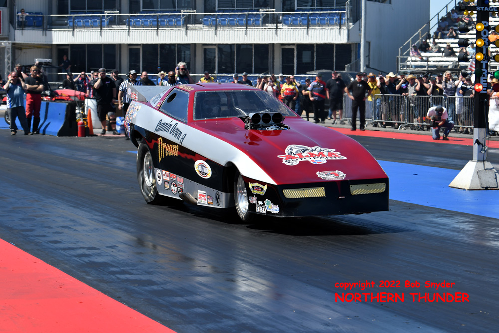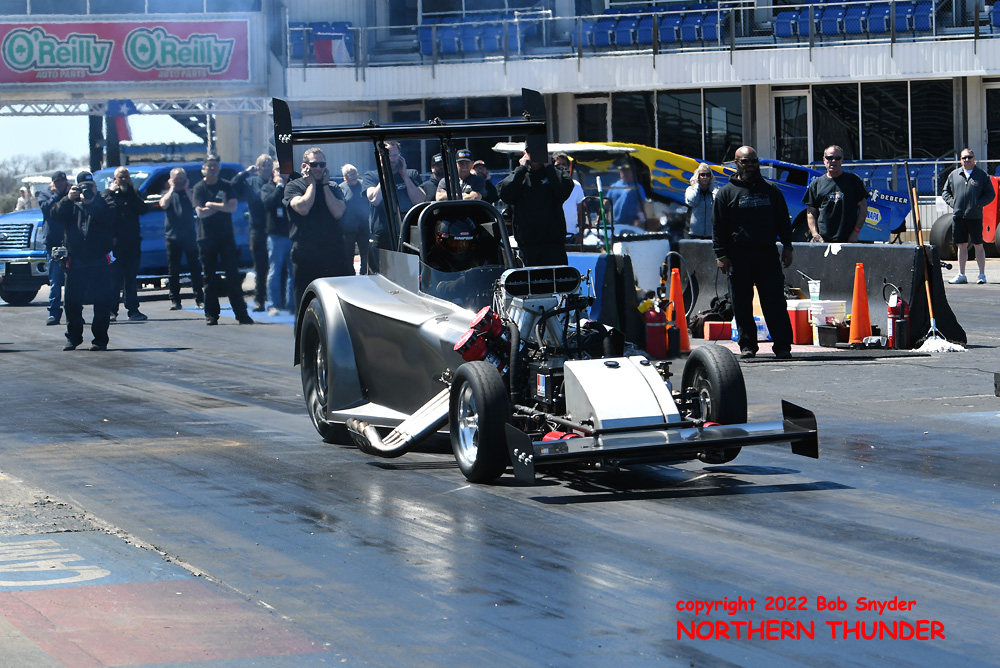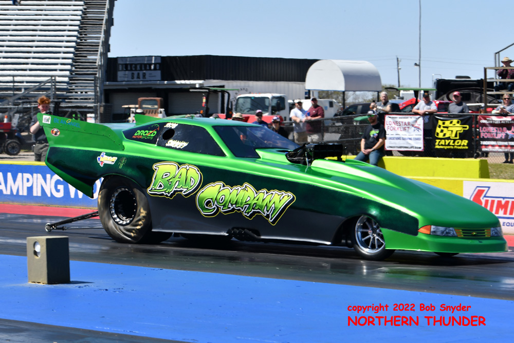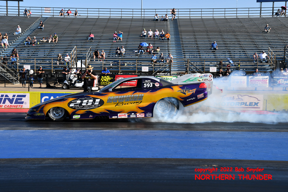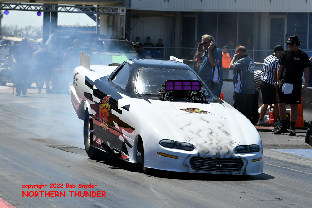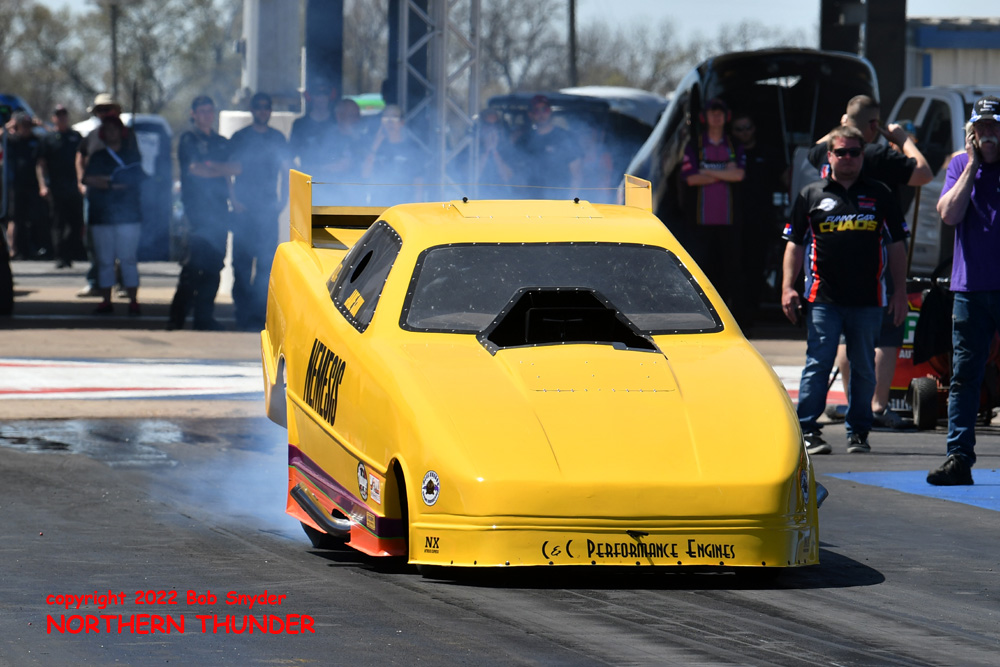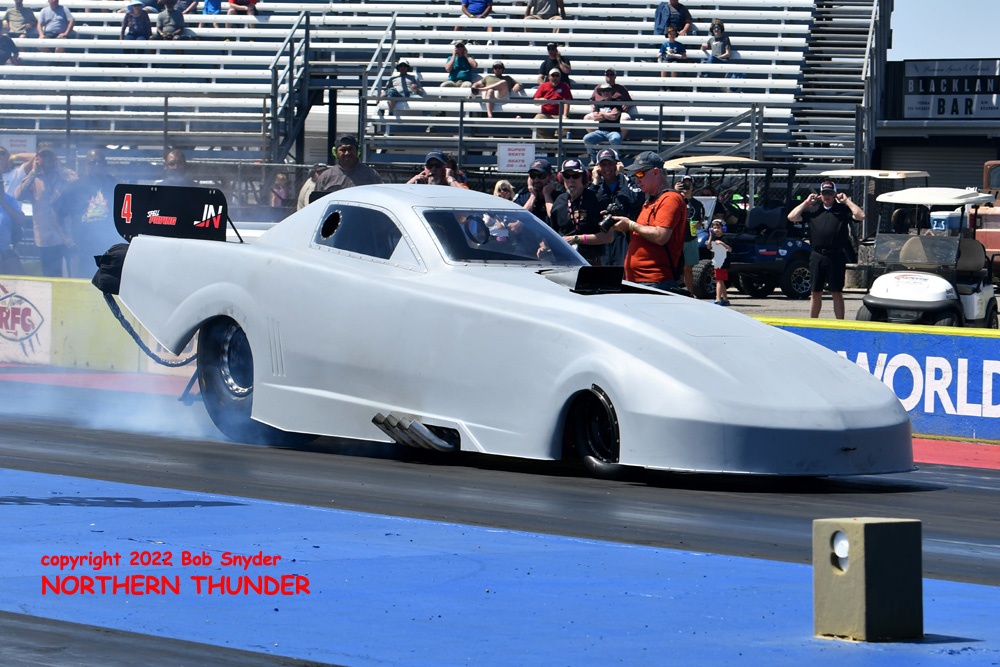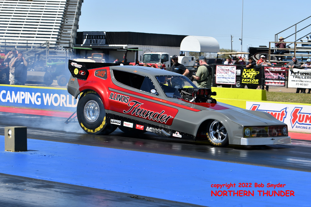 (RIGHT) After a strong finish to the 2021 season, with a runnerup showing in the "A" field at the season finale in San Atonio, Bob Alberty Jr. was looking to keep up that pace with his very colourful "Thunderin' Okie" car. His 4.038 - 181.83 was a good start to his weekend, putting him #19 on the qualifying sheets and near the top of the "C" field.