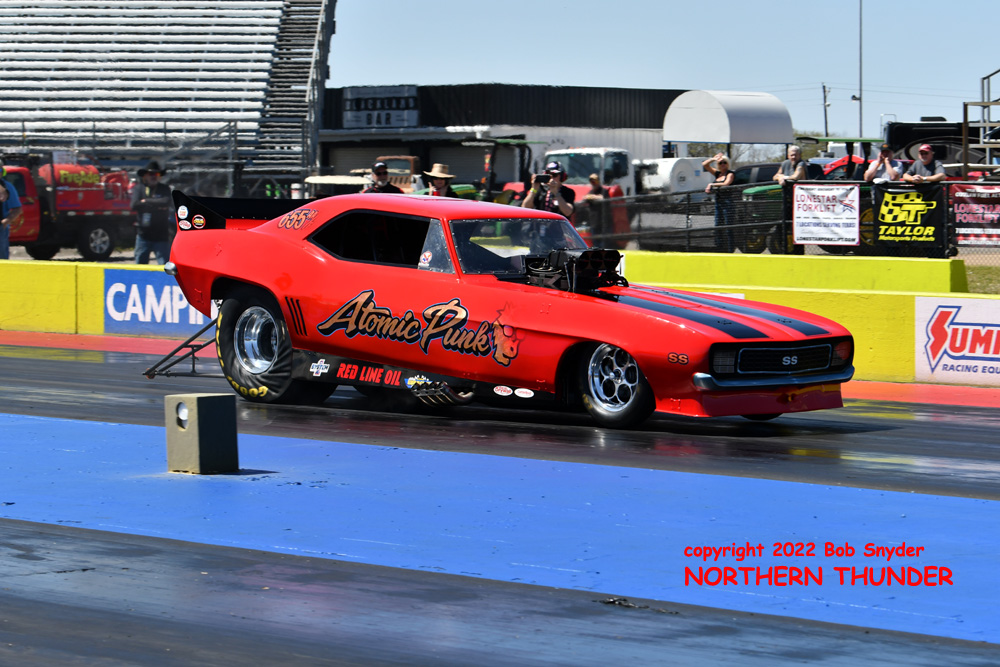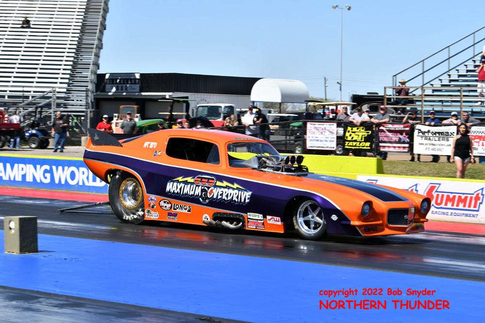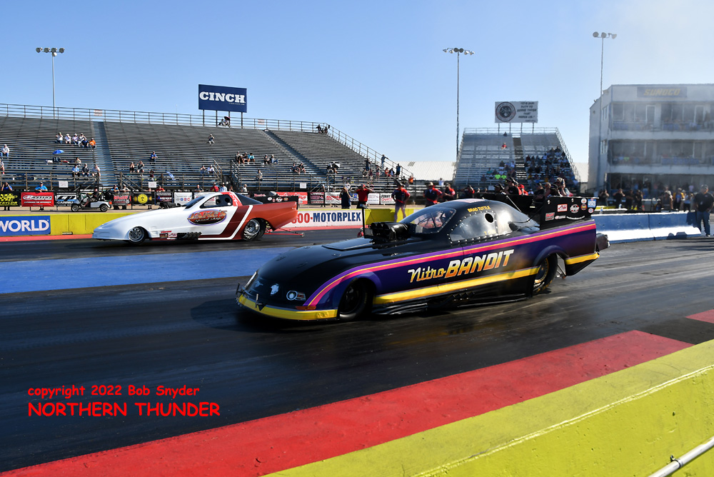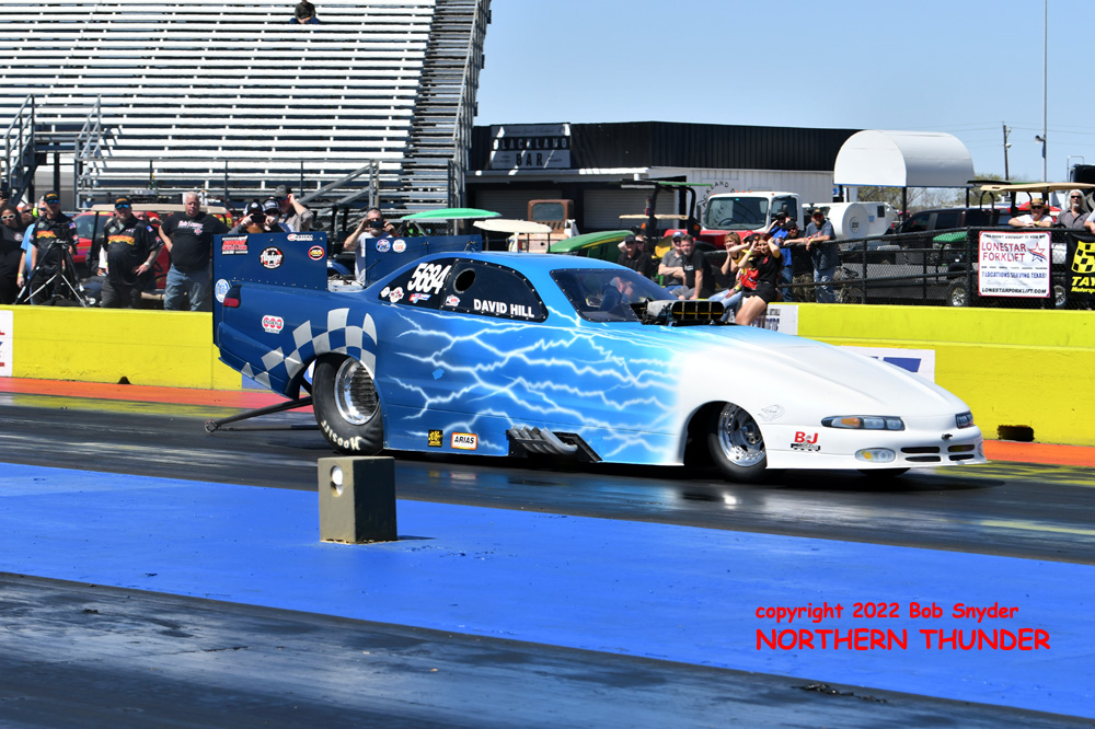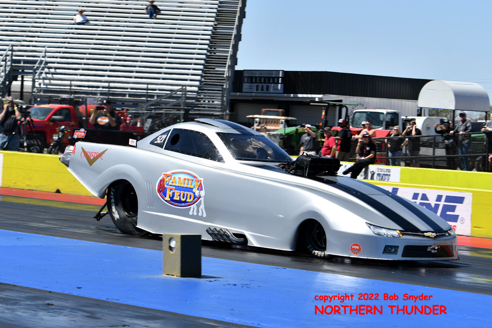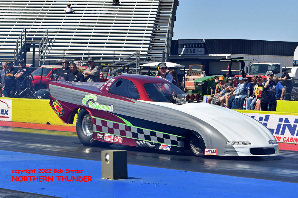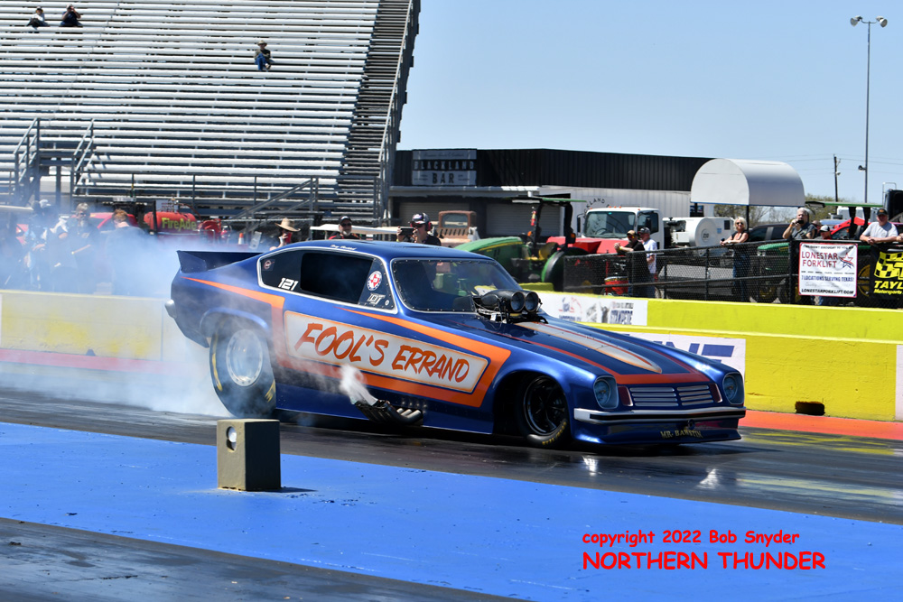 (RIGHT) After a strong finish to the 2021 season, with a runnerup showing in the "A" field at the season finale in San Atonio, Bob Alberty Jr. was looking to keep up that pace with his very colourful "Thunderin' Okie" car. His 4.038 - 181.83 was a good start to his weekend, putting him #19 on the qualifying sheets and near the top of the "C" field.