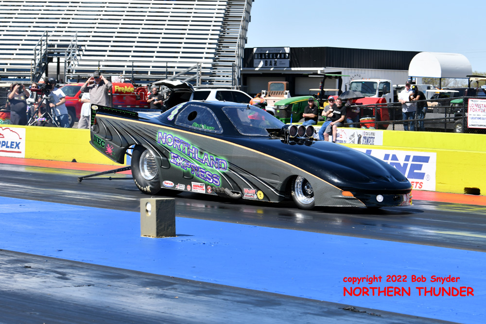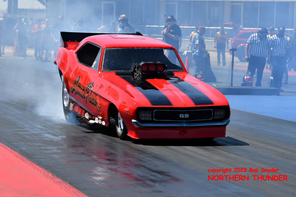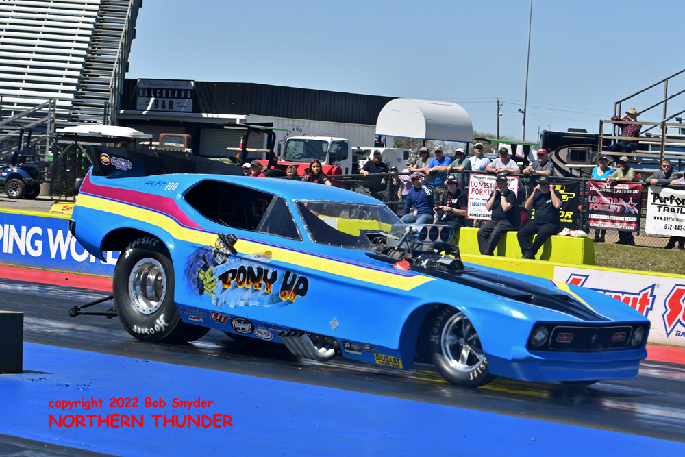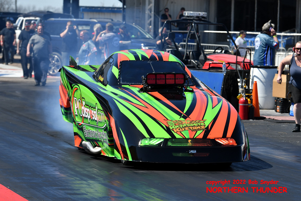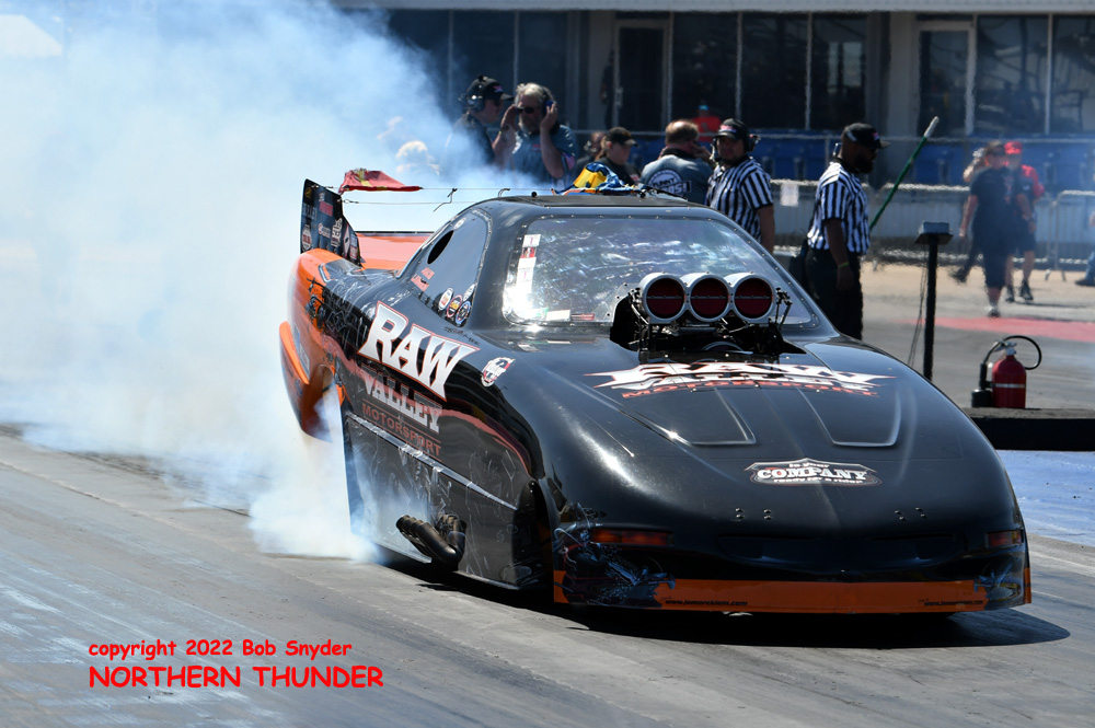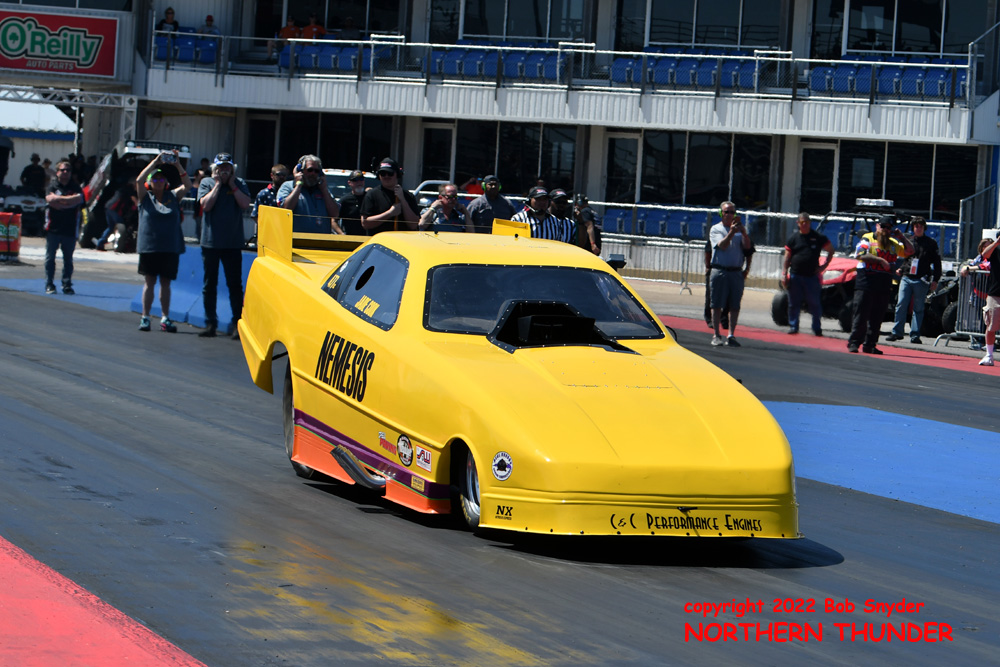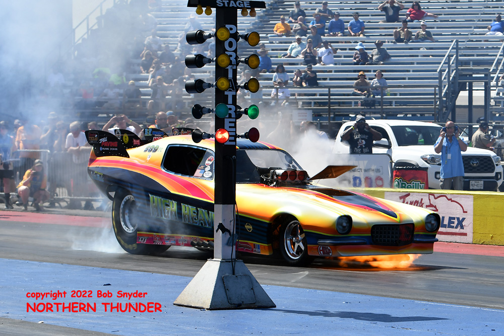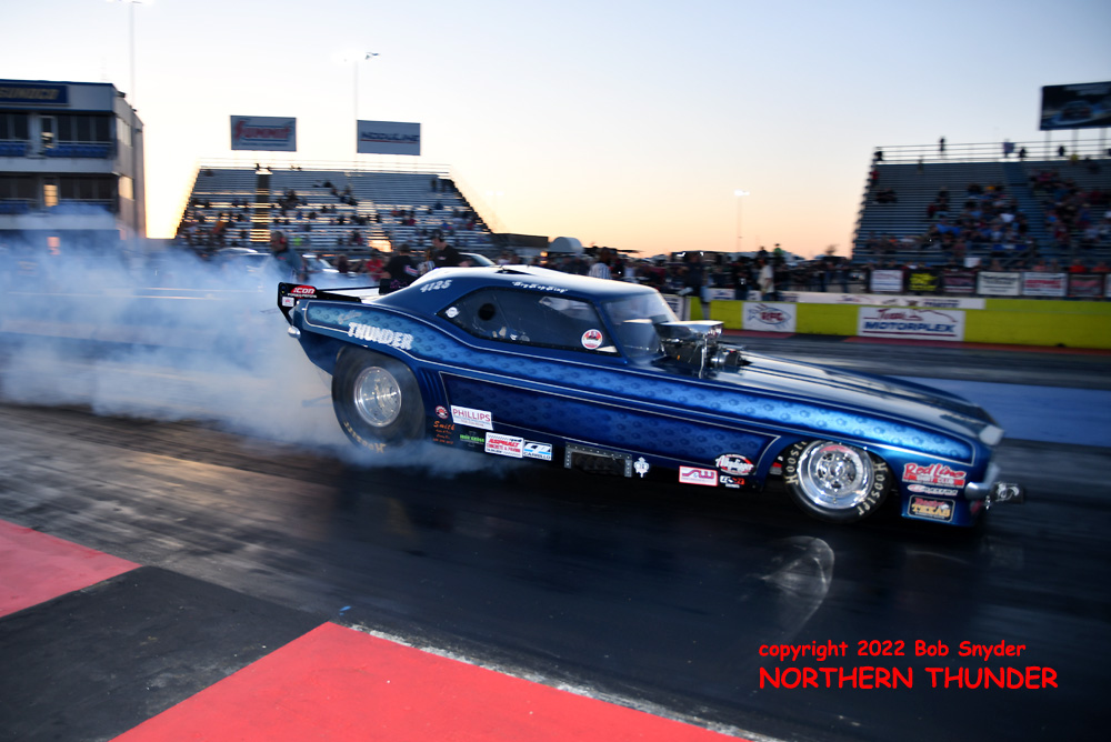 (RIGHT) After a strong finish to the 2021 season, with a runnerup showing in the "A" field at the season finale in San Atonio, Bob Alberty Jr. was looking to keep up that pace with his very colourful "Thunderin' Okie" car. His 4.038 - 181.83 was a good start to his weekend, putting him #19 on the qualifying sheets and near the top of the "C" field.