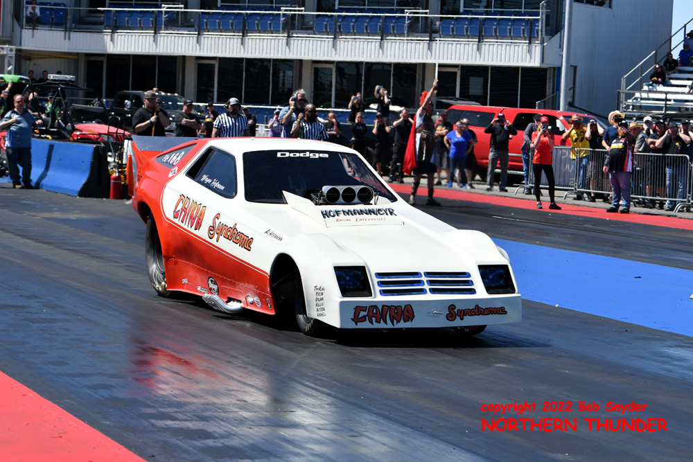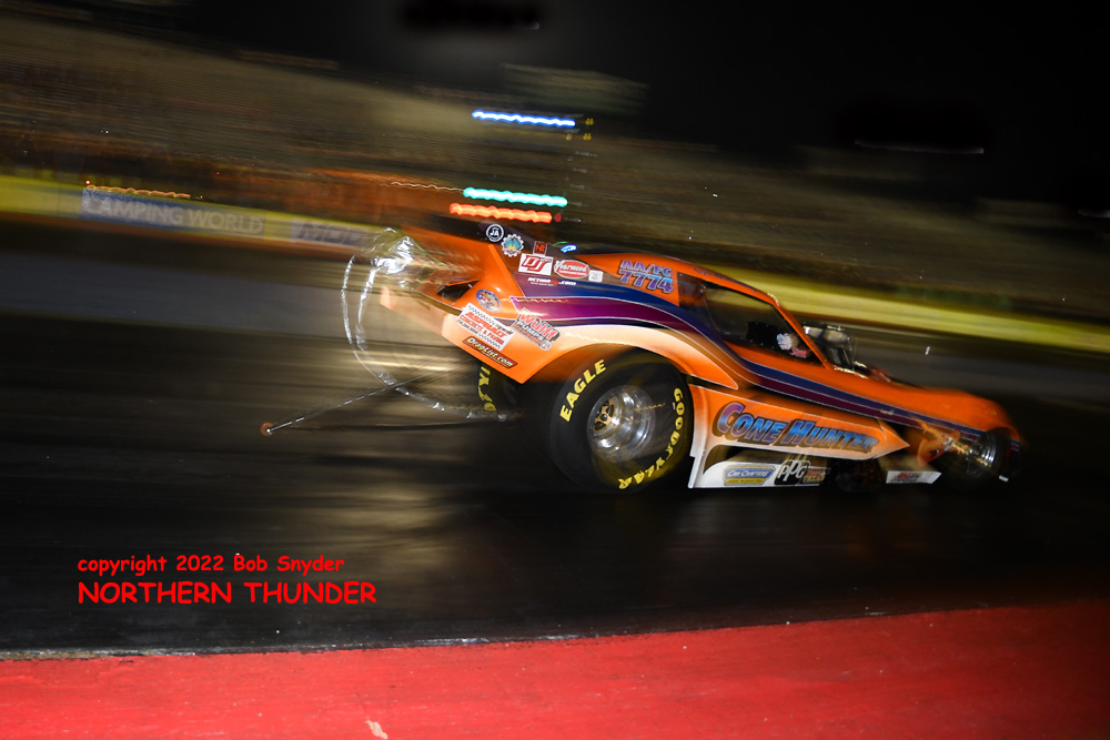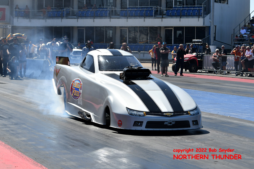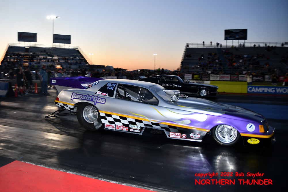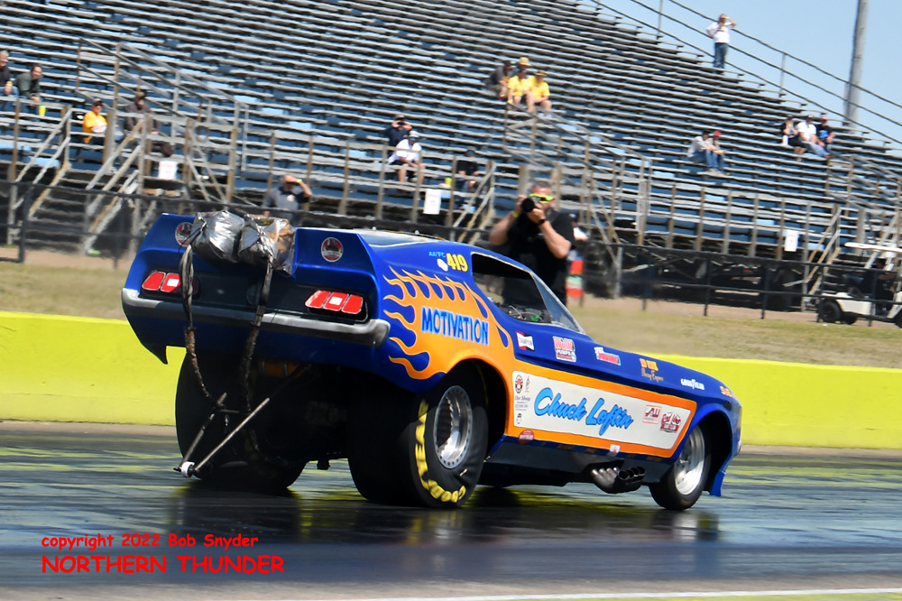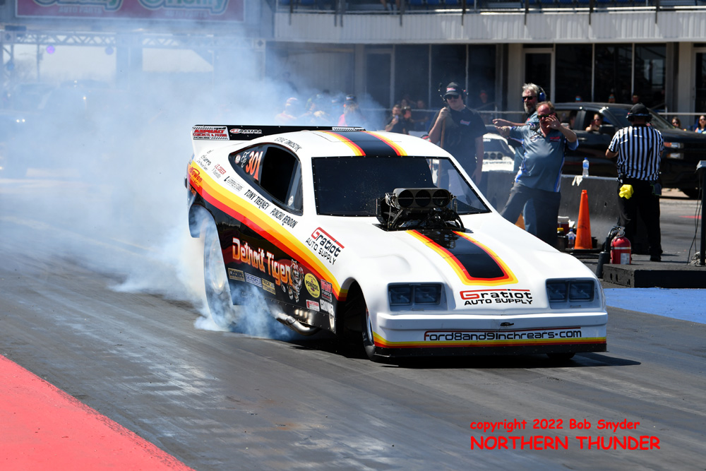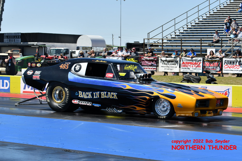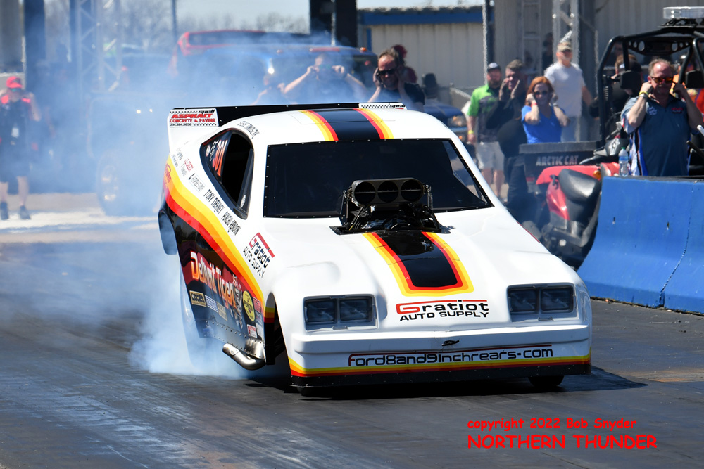 (RIGHT) After a strong finish to the 2021 season, with a runnerup showing in the "A" field at the season finale in San Atonio, Bob Alberty Jr. was looking to keep up that pace with his very colourful "Thunderin' Okie" car. His 4.038 - 181.83 was a good start to his weekend, putting him #19 on the qualifying sheets and near the top of the "C" field.