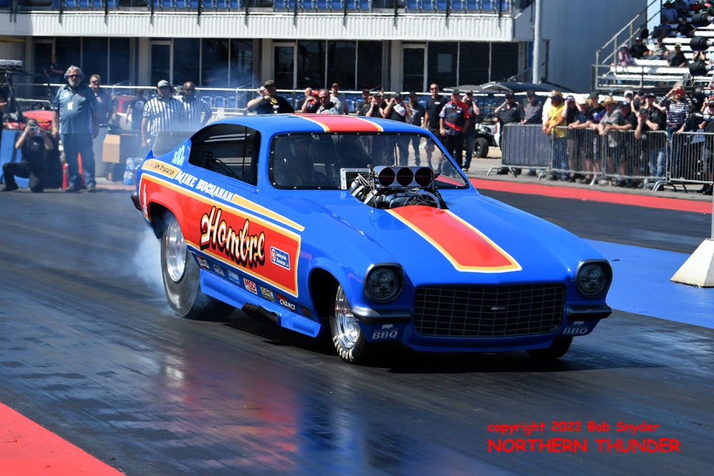 (RIGHT) Still making a very old-school short wheelbase Vega-bodied car work, Mike Buchanan went up in smoke on the launch, then pedalled the "Hombre" to a 6.044 - 108.47 clocking.