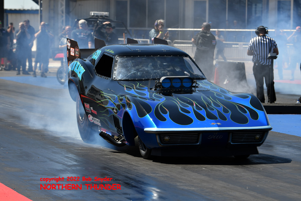 (LEFT) Making another attempt to put down a competitive pass, but falling well short, was Julie Nataas, in the near lane. Her 11-second timeslip was no help for the struggling "Meyer & Nataas" team. In the far lane, Lyle Greenberg had no trouble with his NHRA-legal Nostalgia Funny Car, cranking out a very good 3.759 - 200.86 in his "Cone Hunter" Corvette. That run placed him at the bottom of the "A" field in the #8 position.