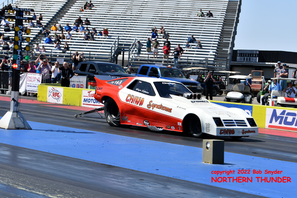 (RIGHT) A name out of the distant past, the "China Syndrome" Dodge Omni of Wayne Hofmann, (son of famous NHRA Nitro Funny Car racer Al Hofmann) debuted his new blown alky car with a troubled 5.016 - 97.84 pass. The car wouldn't shift, necessitating an early shutoff.