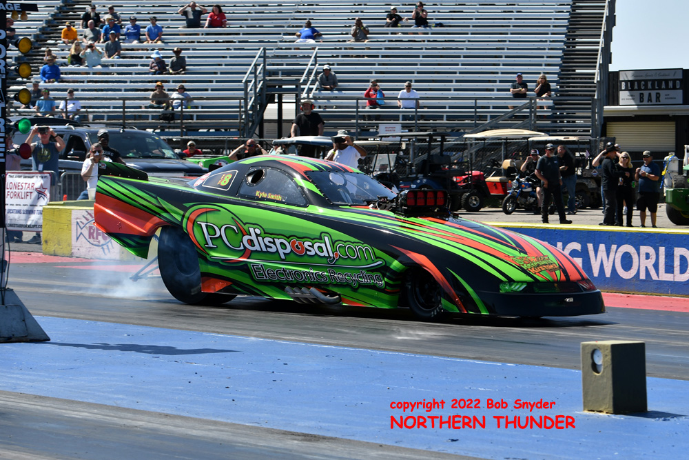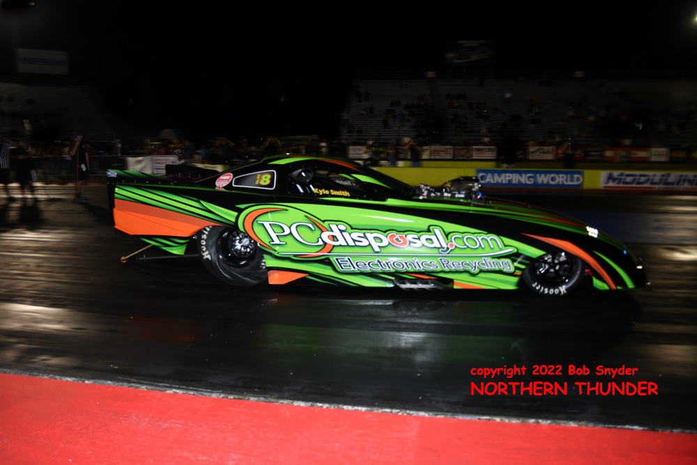 (RIGHT) NHRA regular over the past three years, with a Top Ten finish in Top Alcohol Funny Car in 2021, Kyle Smith pushed his newly sponsored "PC Disposal.com" entry to the second best time of the day, with an excellent 3.560 - 211.33 lighting up the scorebaords.