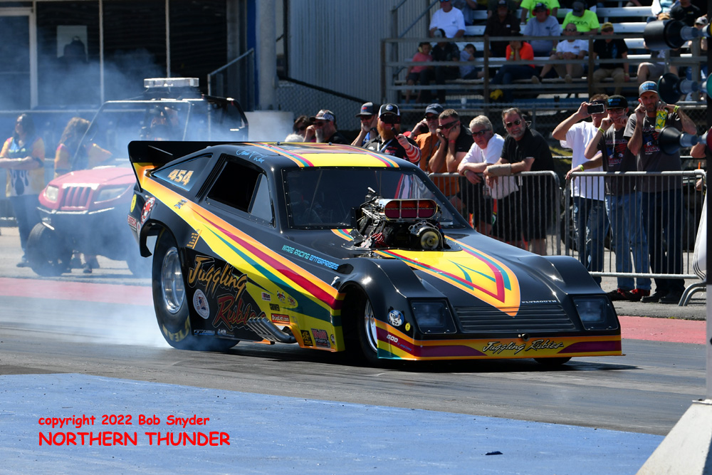 Warming up the Hoosiers in the photo on the left, the "Northland Express" of Mitch Bowen, who had been off the FCC "tour" since last May, laid down a good 4.016 - 180.63 that close to the magic 3-second territory, placing him #19 on the provisional list, and solidly in the "C" field. Running beside him in the photo on the right was Charles Ware in his "Juggling Rubies" entry, as he made a solid 4.561 - 168.65 pass. That put him #35 on the list and just outside the "D" field.