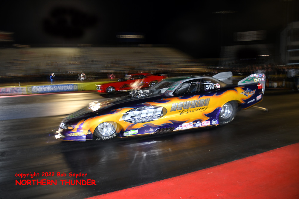 (RIGHT) In full darkness, the cars were well illuminated under the Motorplex lights, as Mike Newkirk went on a single into the final round. His solid 4.059 - 185.72 wasn't necessary as opponent Terry Totten, sat in the pits after suffering major engine damage in the first round.