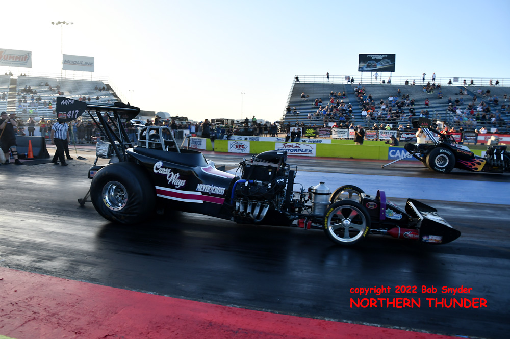 The Outlaw Fuel Altered final pitted two of the toughest racers on the circuit, with four time series champion Jimmy Jones in his "Texas Tremor" in the near lane, facing defending series champion Keith Zimmerer in his "Penny Pincher" entry. We don't have any results to report at this point.
