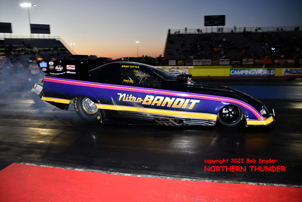 (LEFT) With the skies darkening as the sun hit the horizon, the second round started with the flames showing brightly from Brad Tuttle's Nitro Bandit in the near lane. Bryan Brown (far lane) took an early lead off the line and kept the lead to the 330' mark before Tuttle's BIG horsepower took over and turned on the winlight with a very quick 3.503 - 199.04, despite a very early shutoff. Brown gave it his best shot, with a five hundredths holeshot, another five hundredths quicker 60' time, but fell short with a 3.707 - 207.25 clocking.