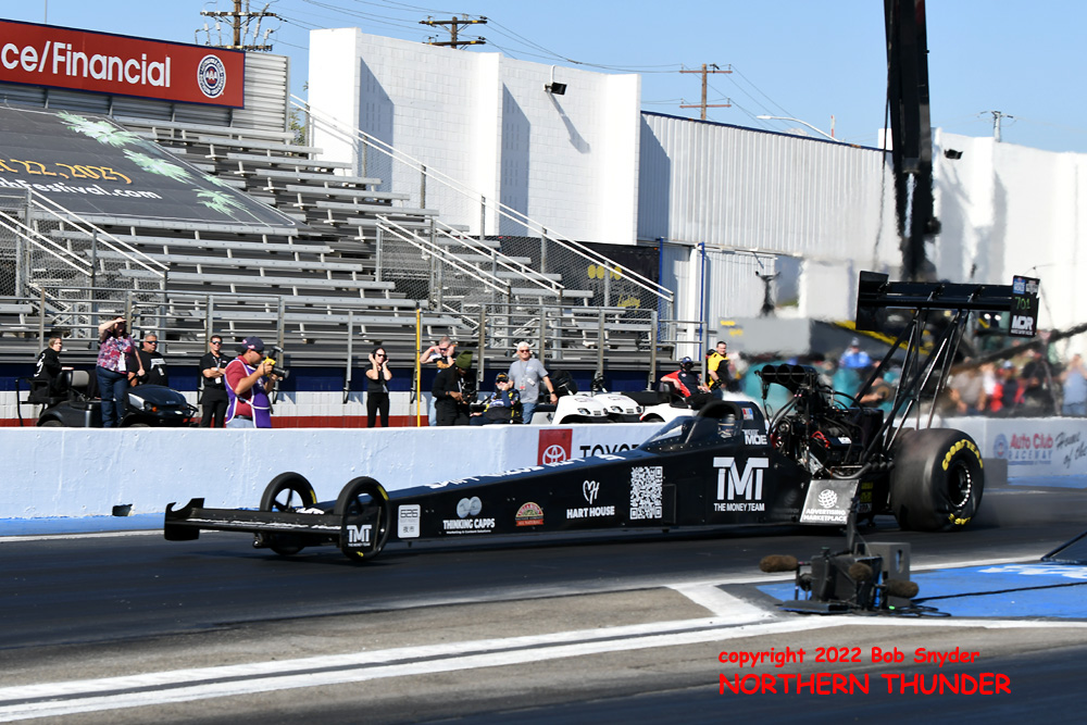 with the quickest cars in the class, and came into Pomona fourth in the points standings. On this run he was on pace to nearly equal his Friday best of 3.864, but he