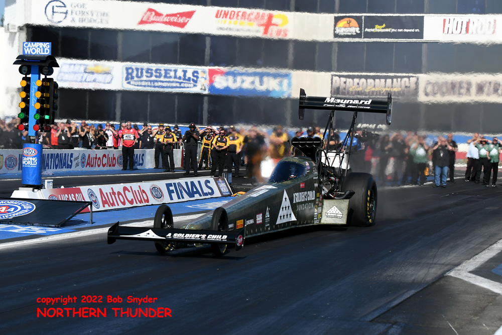 With a new ARMY-look camouflage wrap, bannering "A Solider's Child Foundation", driver Tony Schumacher jumped up the list six spots (from #12 to #6) with a great 3.701 - 331.77 effort. It was nearly his quickest pass of the entire season.