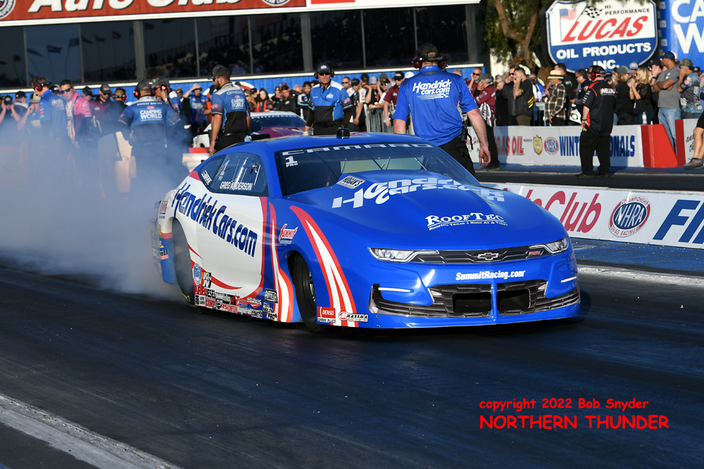 After a first round loss at the previous race (Las Vegas), Greg Anderson was definitely on the rebound with a 6.509 best during qualifying here. It was just .001 slower than Troy Coughlin Jr.'s top qualifying effort. On his final qualifier, Anderson launched hard but encountered some serious tire shake early and shut off to an 8-second clocking.