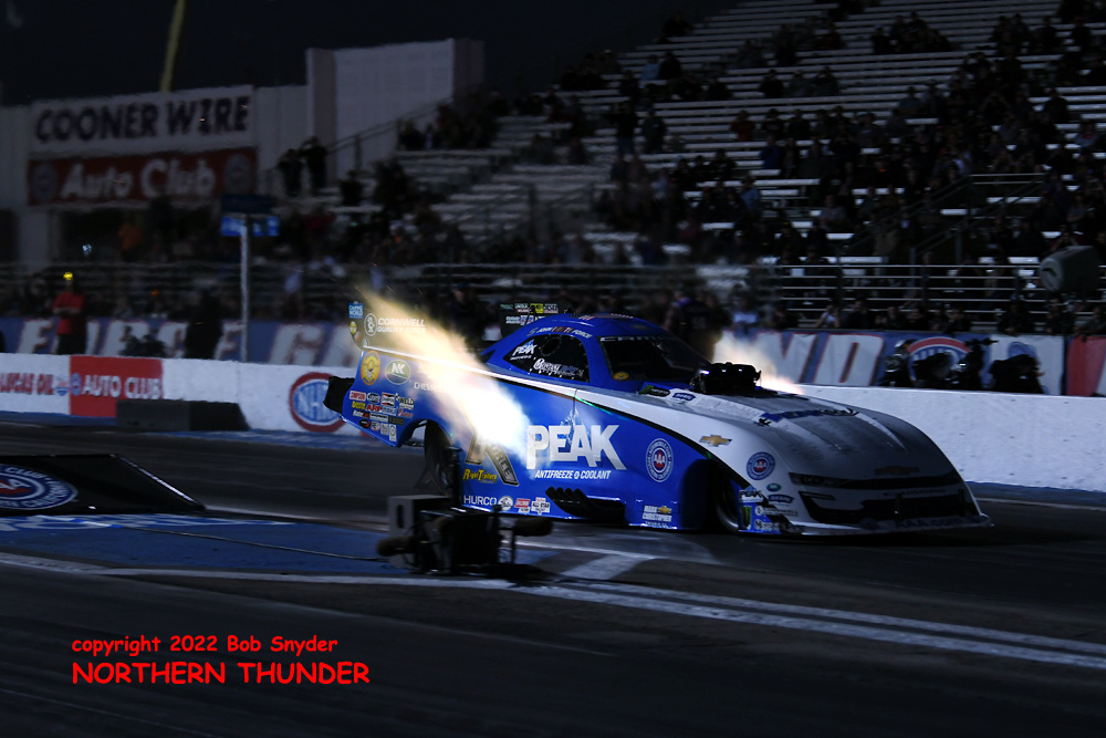 Almost before the smoke from the final burnouts in the dragster round had cleared, the Funny Cars started running, and the first pair out provided some high drama. With their backs literally against the wall, the Rick Jackson Motorsports team, with Shane Westerfield driving needed to win the entire event to have any chance of overtaking points leader Doug Gordon. Westerfield managed to keep his reaction time on the right side, with a conservative (for him) .056 light, and took out Jim Whiteley in a close race. That was one down, and three more to go.