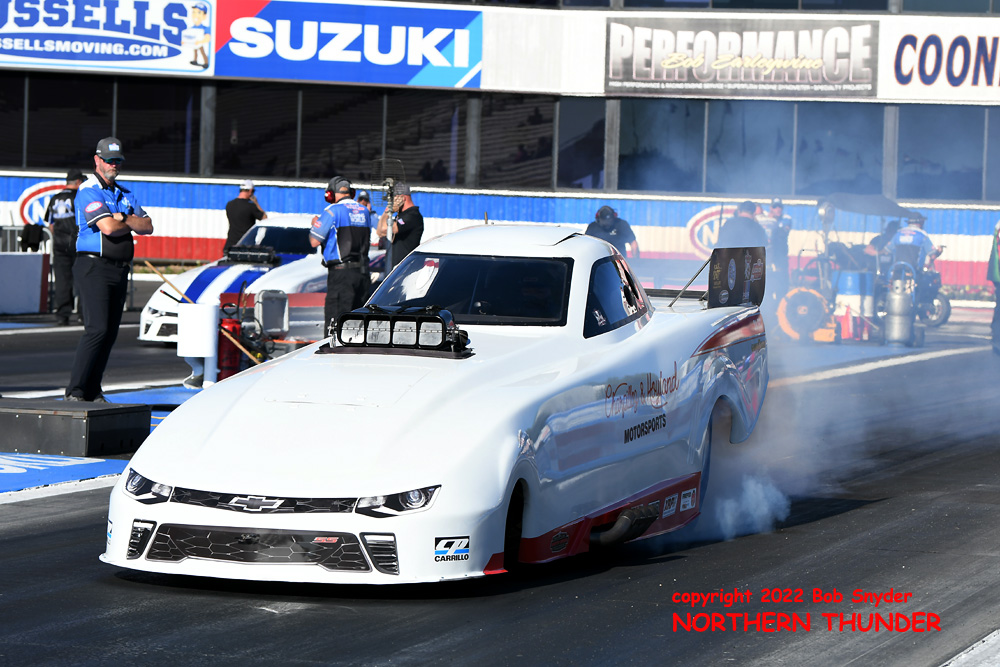 Interestingly, we may be seeing the last Top Alcohol Funny Car race where the blown alcohol combination dominates the field, as it remains the sole option available until next season's introduction of the A/Fuel Funny Car combination. The world championship for 2022 in TAFC was decided quickly as the last racer with a chance of catching Doug Gordon did what he's been so very prone to do in the last two months, and redlighted away what would have been a winning pass. Shane Westerfield threw away a 5.442, making Annie Whiteley's very good 5.476 e.t. a winning one and advancing her to the semifinals.