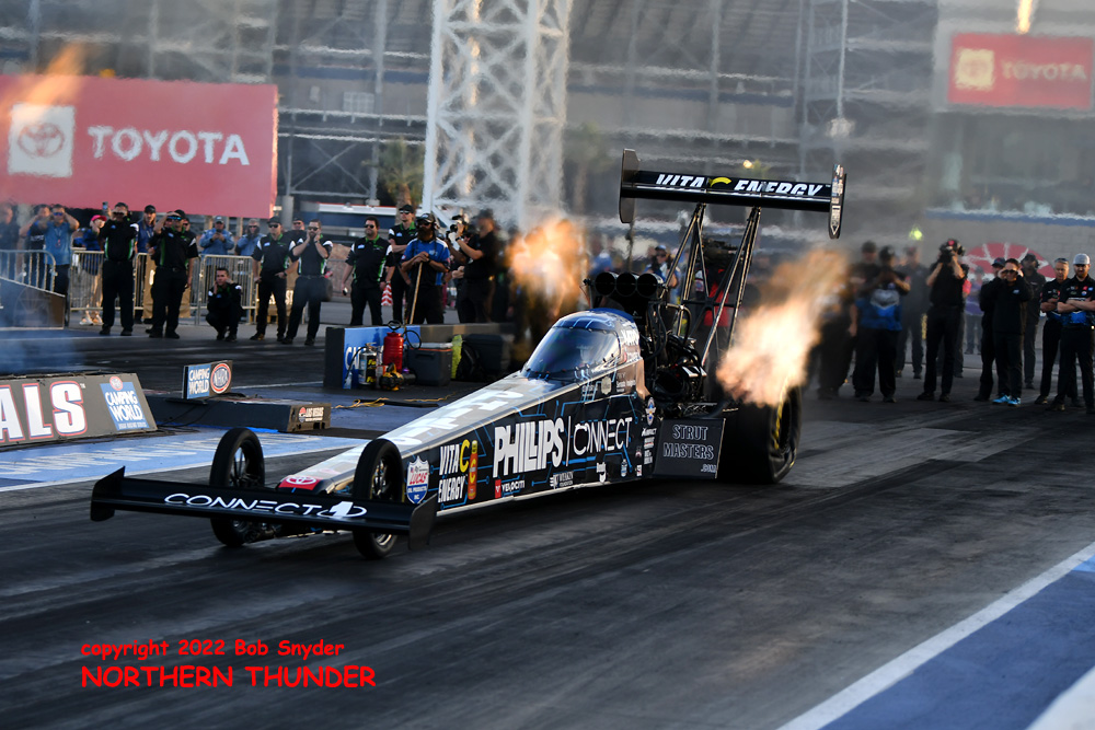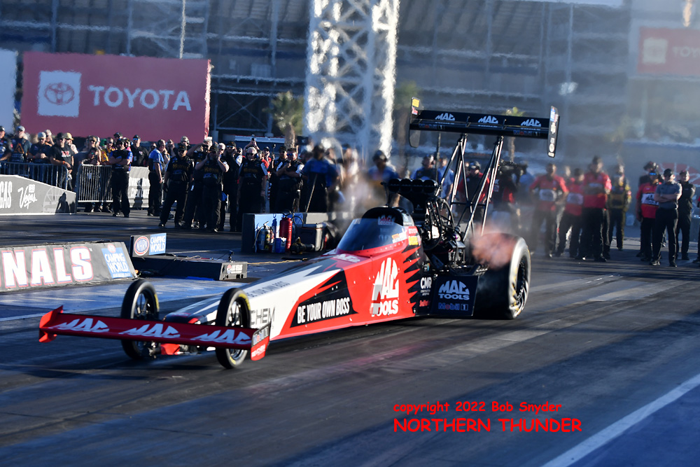 (RIGHT) Making it to the 300' mark before trouble set in, Tony Schumacher slowed to a 4.95 - 143.08 that left him in the #10 spot going into Saturday's final two qualifying sessions.