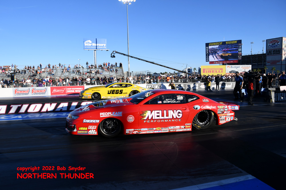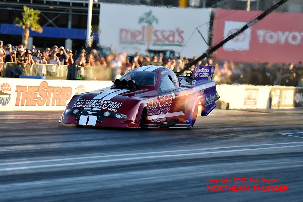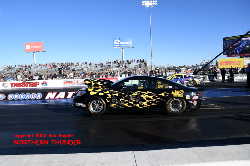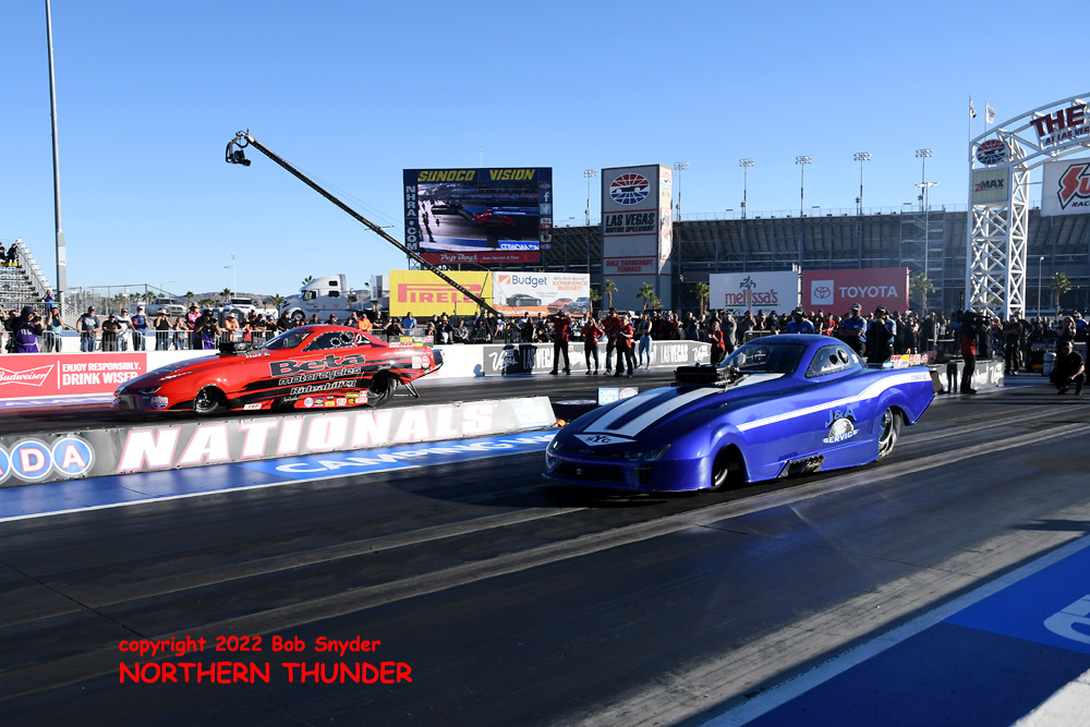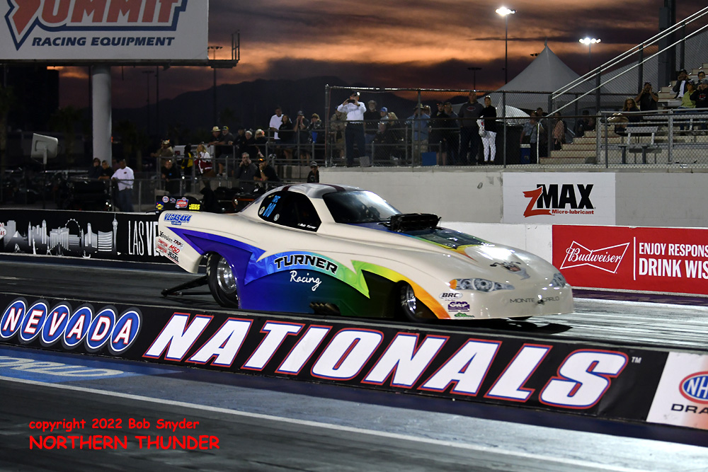(LEFT) Making the long trek from the East Coast, championship contender D. J. Cox Jr. made his Las Vegas debut as he fought to remain in the points chase. His first session 5.501 - 264.80 had him in the #5 spot, but this time he had to fight the car all the way down the track, and amazingly, nearly his earlier run with a very good 5.513 - 262.64 timeslip.