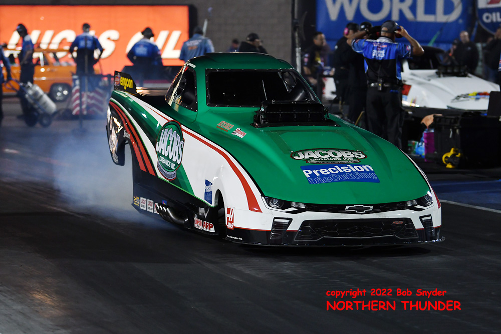 (RIGHT) Going in the opposite direction to Alexander, Cruz Pedregon gave up his #10 spot and dropped back one notch as the car got loose and started smoking the tires before the 330' mark.