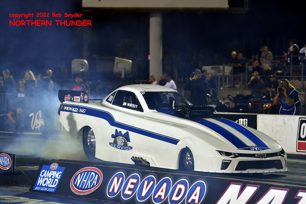 (RIGHT) Skipping the third qualifier, the Jim Head car, driven by Blake Alexander was unable to regain the #11 rung on the ladder (taken by Jim Campbell one pair earlier), as the car overpowered the track early and shut off in a cloud of tire smoke to a 6-second pass.