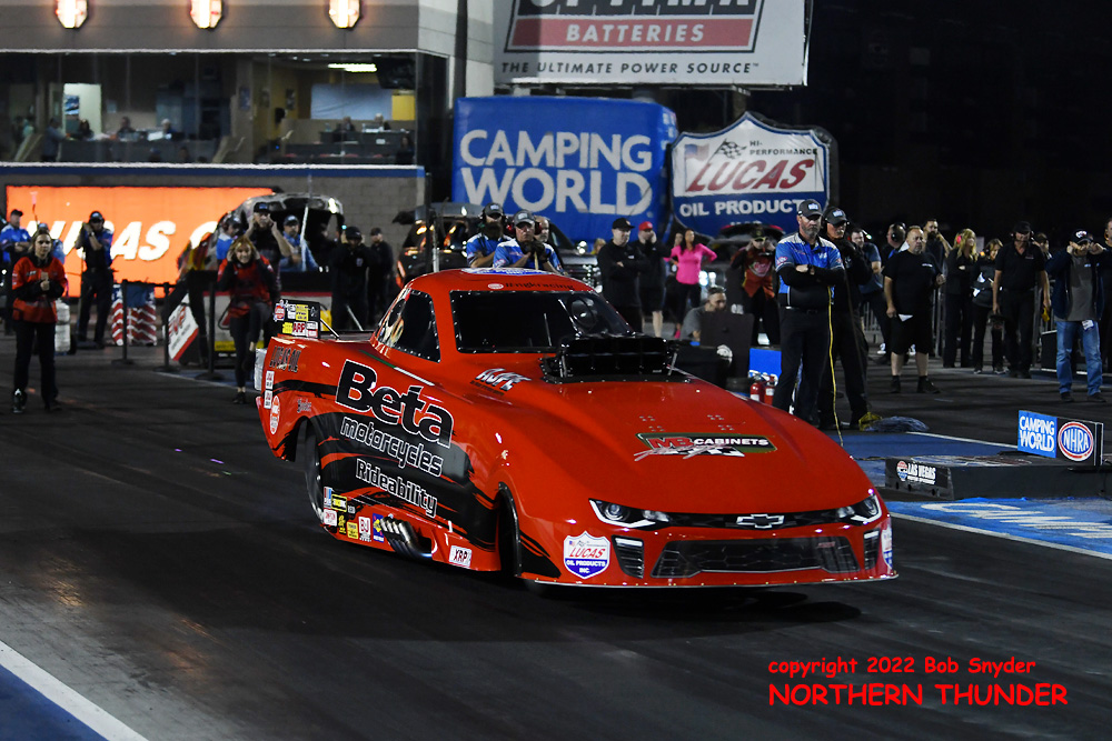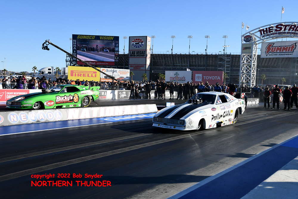 (LEFT) Based on first session performances, two of the "hitters" lead off the second round of qualifying. Leah Pruett improved dramatically and jumped into the top half of the field with a great 3.746 - 329.18 pass.
