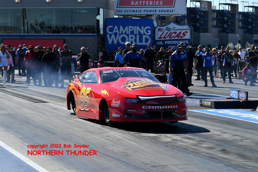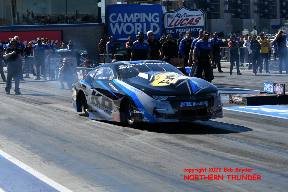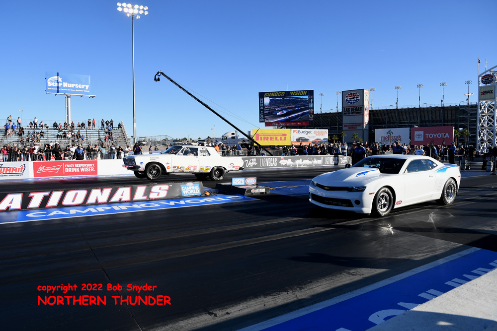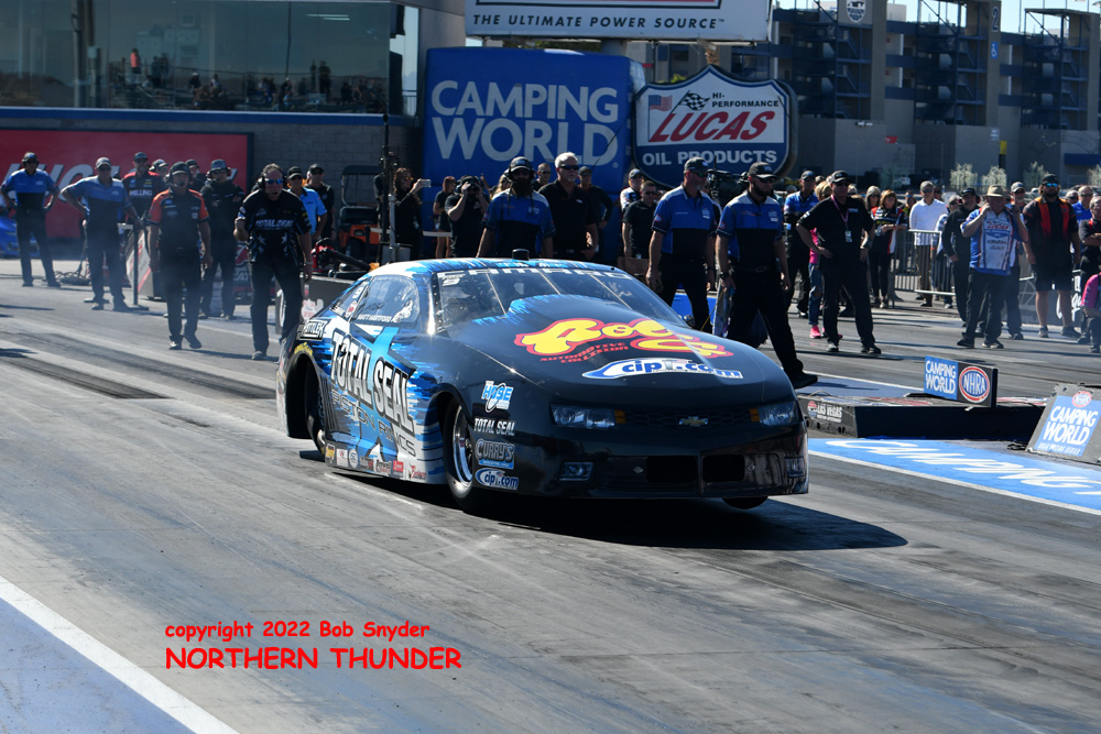 (LEFT) Sitting outside the field in the #10 spot was Bill Windham in his "Shakedown" Camaro. Needing to improve by half a tenth to move into field with it's current 5.06 bump spot, he failed to hook up on the launch and shut off to a 12-second clocking and an early ticket home.