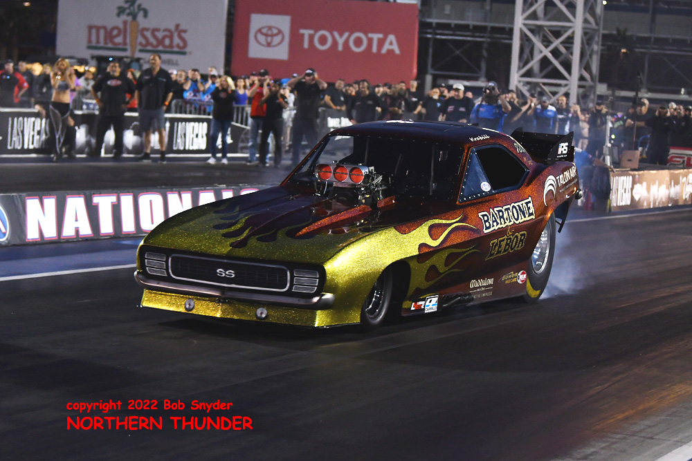 (RIGHT) Five-time Heritage Series Funny Car champion Bobby Cottrell, driving the "Northwest Hitter", ran hard for a few hundred feet but had to lift before he crossed the center stripe. His 6.026 - 121.20 was no help, but he remained in the top spot in the field with his earlier 4.758 - 237.09 effort.