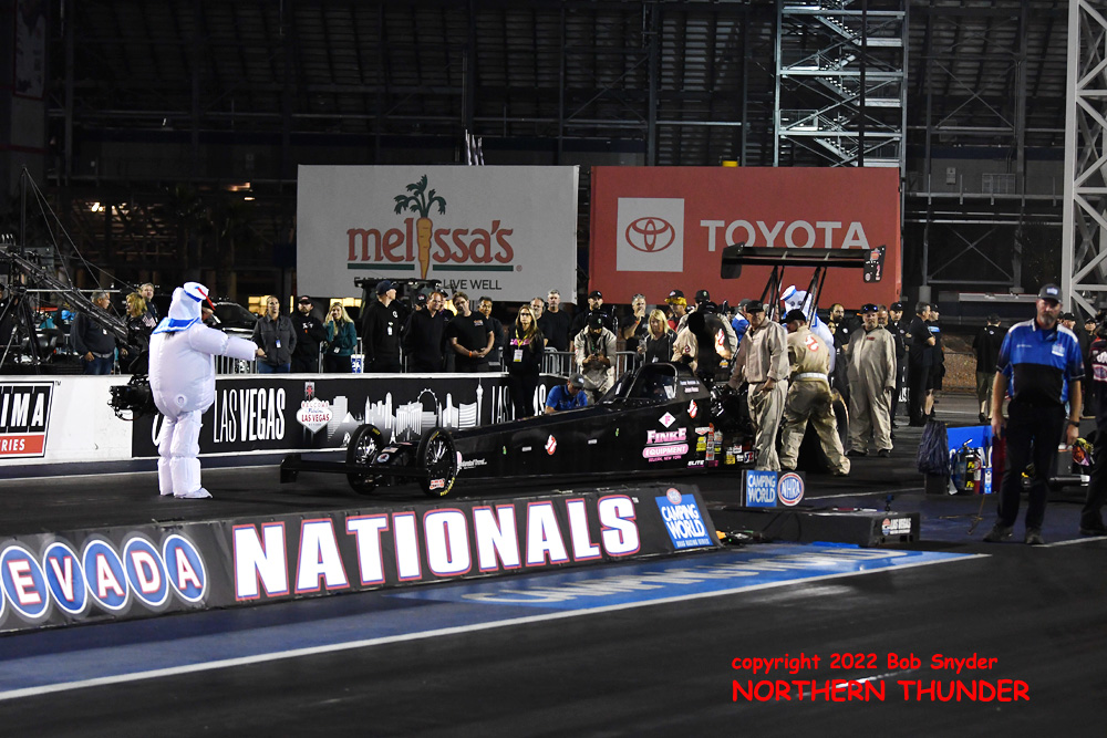 Hoping to wrap up her fifth world championship at this event, Erica Enders came into the session in the #2 spot but had fallen to #4 with the great performances from Kramer & Koretsky. She let everyone know that she intended to dominate this event and took back the top spot with a new low e.t. and top speed as 6.579 - 208.75 flashed up on the scoreboard. NOTE: It appears she was standing outside the car in civilian clothes and her helmet off, but that was her sister helping rid the cockpit of burnout smoke before the run.